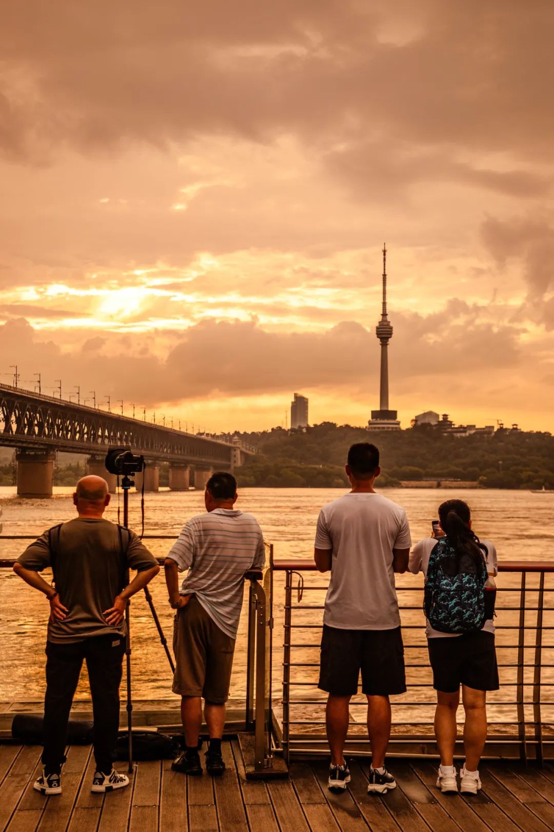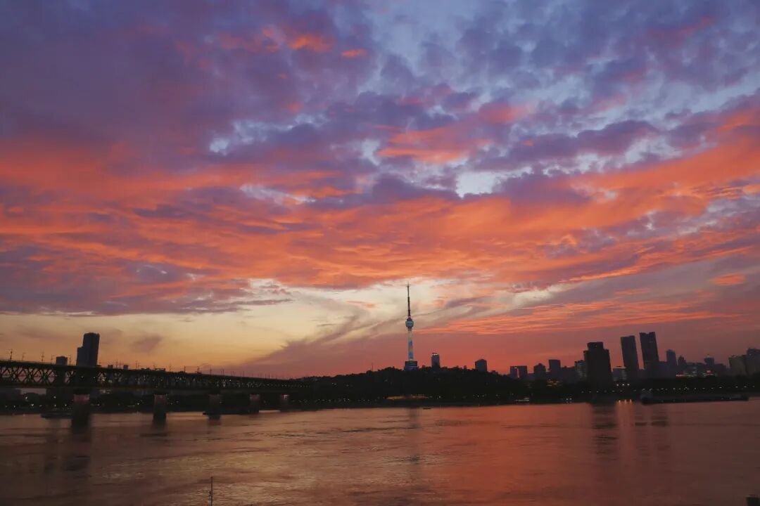 桥上赏江景,桥下看夕阳。在武昌临江大道汉阳门码头,静待红日将落,晚霞如火般映红整个江面,与好友一起见证落日与晚霞的双向奔赴,怎能不感叹一句:浪漫至死不渝。