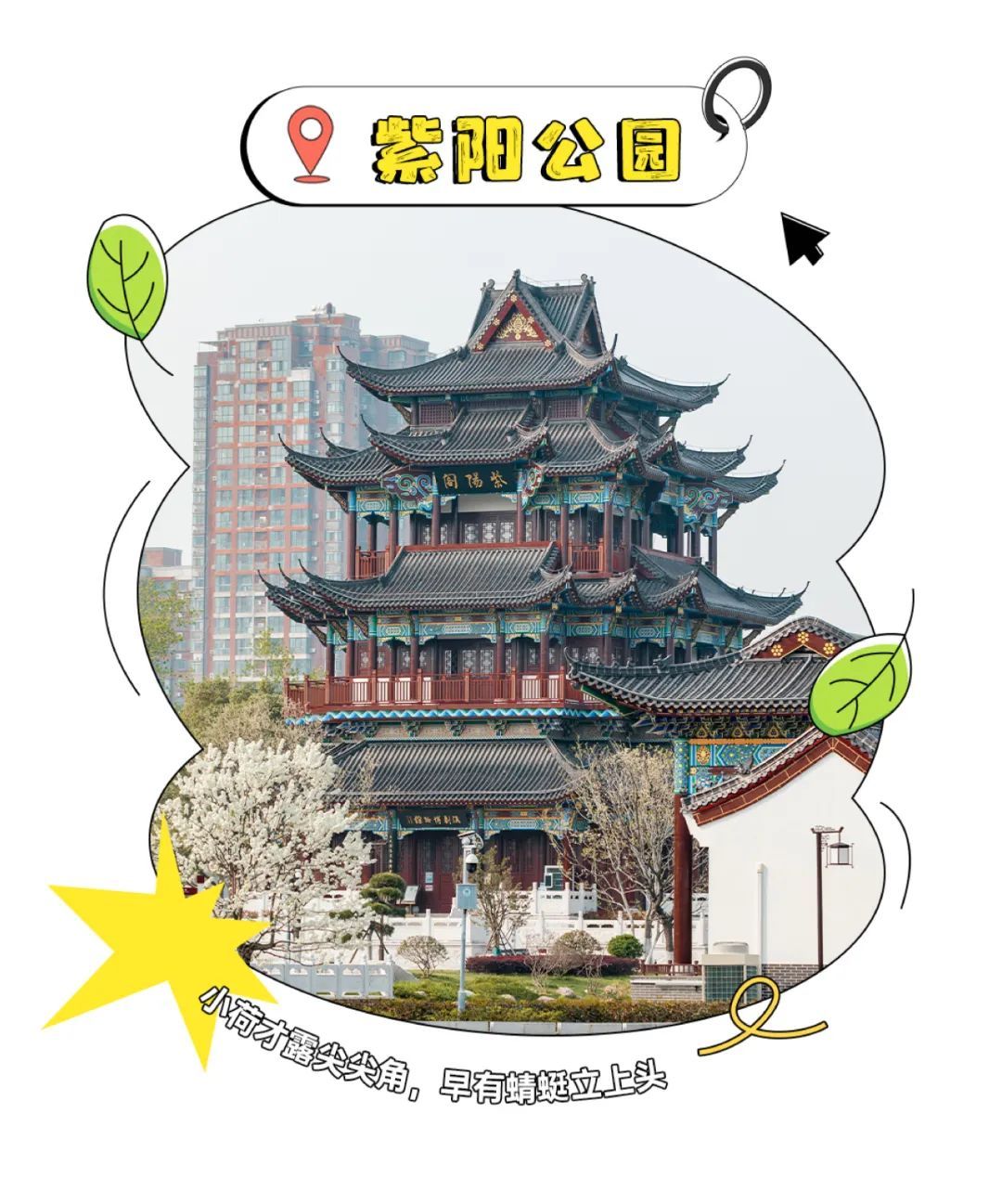 园内紫阳阁耸立于玉阁琼岛,飞檐翘角,古色古香,充分挖掘紫阳湖历史文化,打造文化景区,提供了俯览公园美景的制高点,让古城文化轴更加完善。