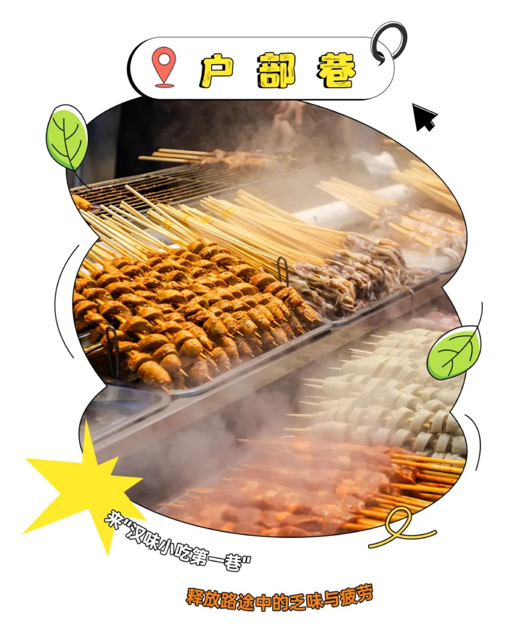 户部巷连接着民主路和自由路,东靠十里长街(解放路),西临长江,南枕黄鹤楼,北接都督府。一条长150米的百年老巷,其繁华的美食摊群,数十年经久不衰。