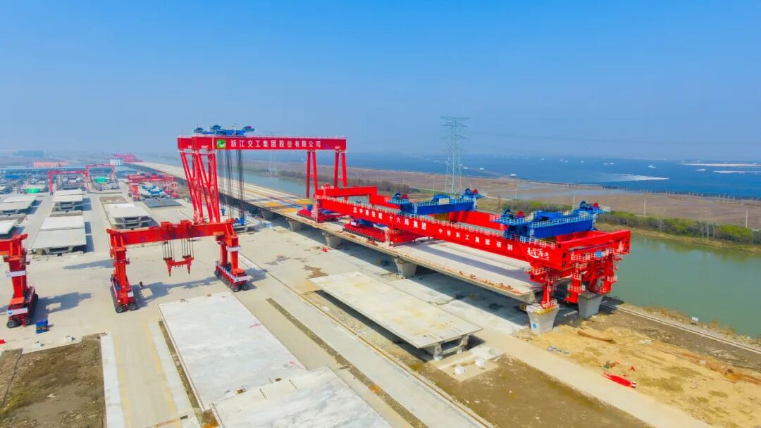 ▲中铁科工研制的世界最大吨位整孔预制箱梁运架装备“越海号”在杭甬高速复线施工