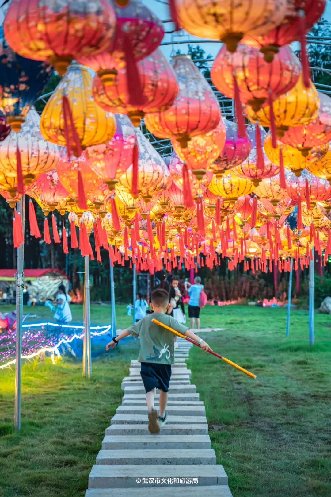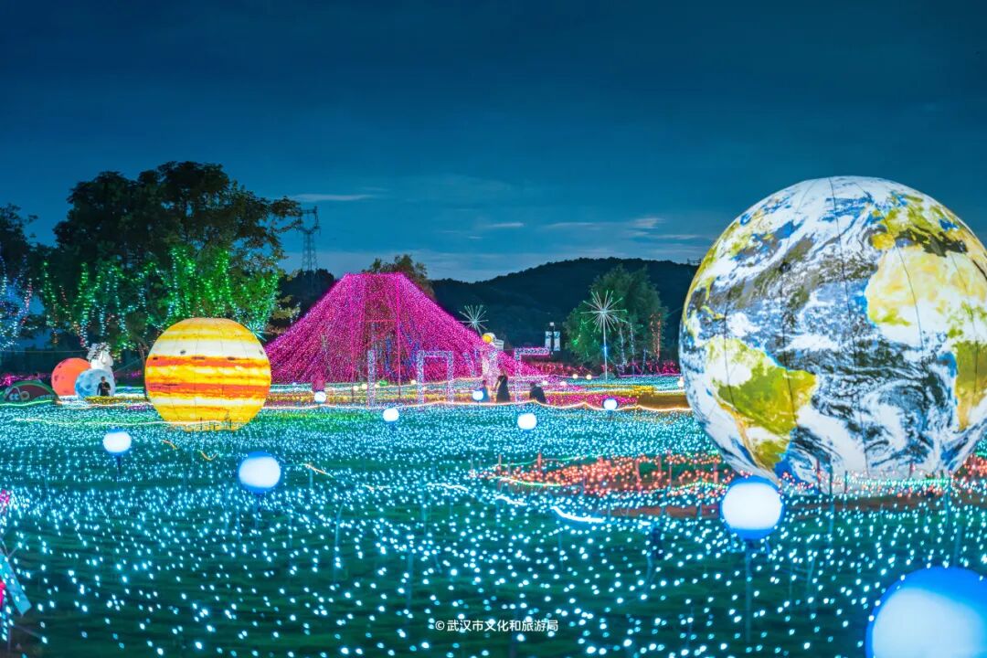△22000㎡的绿草地上铺满璀璨灯光,长颈鹿/凤凰/地球/宇航员造型的花灯立在灯海里,19:30前后点亮。