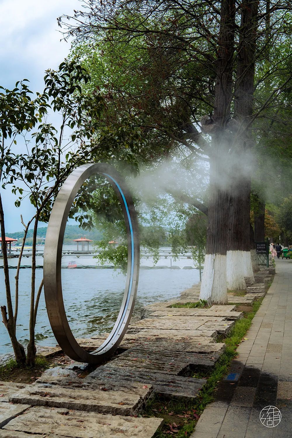 但你知道吗?听涛景区临湖沿线的圆环框架,除了能当作取景框外,还带有雾森喷雾系统,每隔10分钟喷发一次水雾,每次持续10秒。