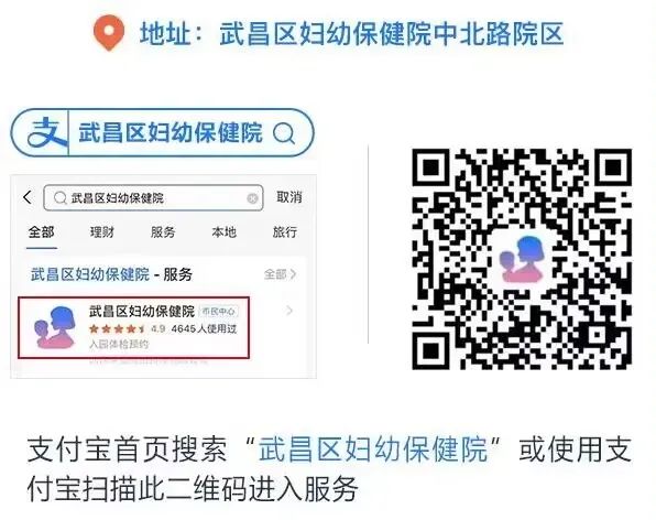 (1)请家长们提前在支付宝预约挂号,打开支付宝→搜索“武昌区妇幼保健院”或使用支付宝扫描此二维码进入小程序选取“入园体检”服务。根据要求填写入园体检预约信息。