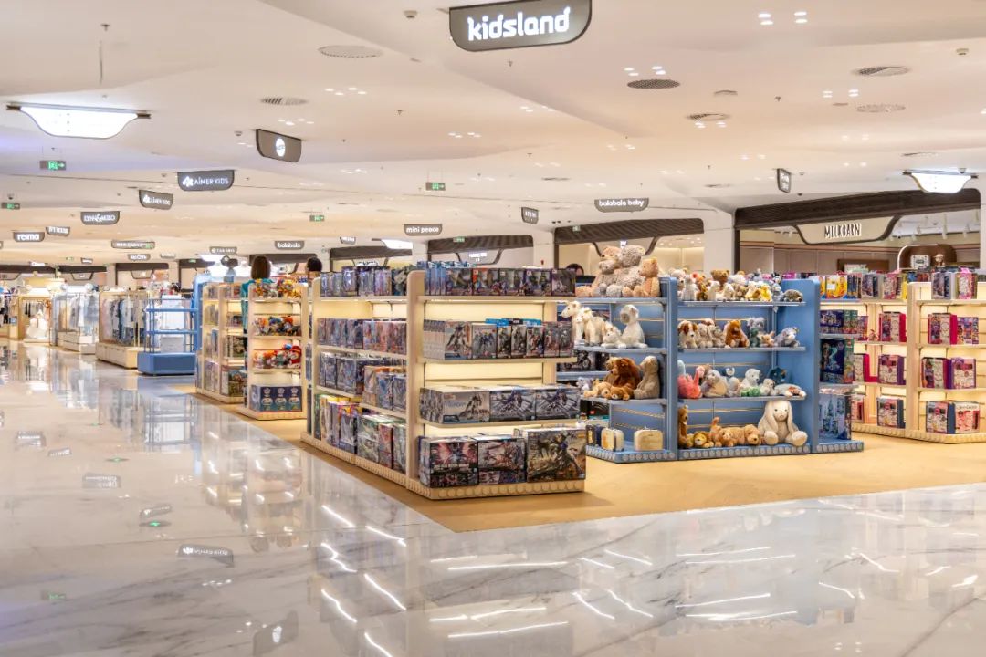 4F儿童区针对家庭消费场景需求,多维度组合引入包含多家大牌童装独立店在内的37 个品牌,包含了童装、童鞋、婴童、玩具四大板块。