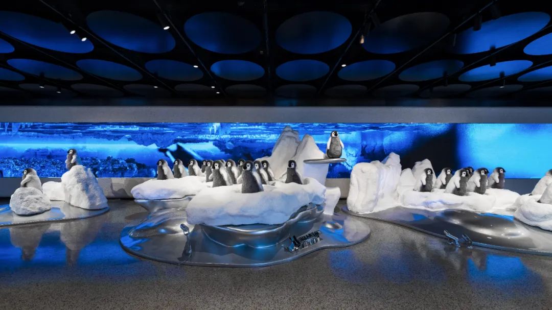 在《覆羽》展示区,一群憨态可掬的企鹅则展现出独特的适应性,在相对舒适的雪洞中筑巢,也尝试到更远的海域探索觅食。这里还有个惊喜彩蛋,站在指定位置挥手,企鹅们会根据你的动作左右转身和点头回应,非常可爱。