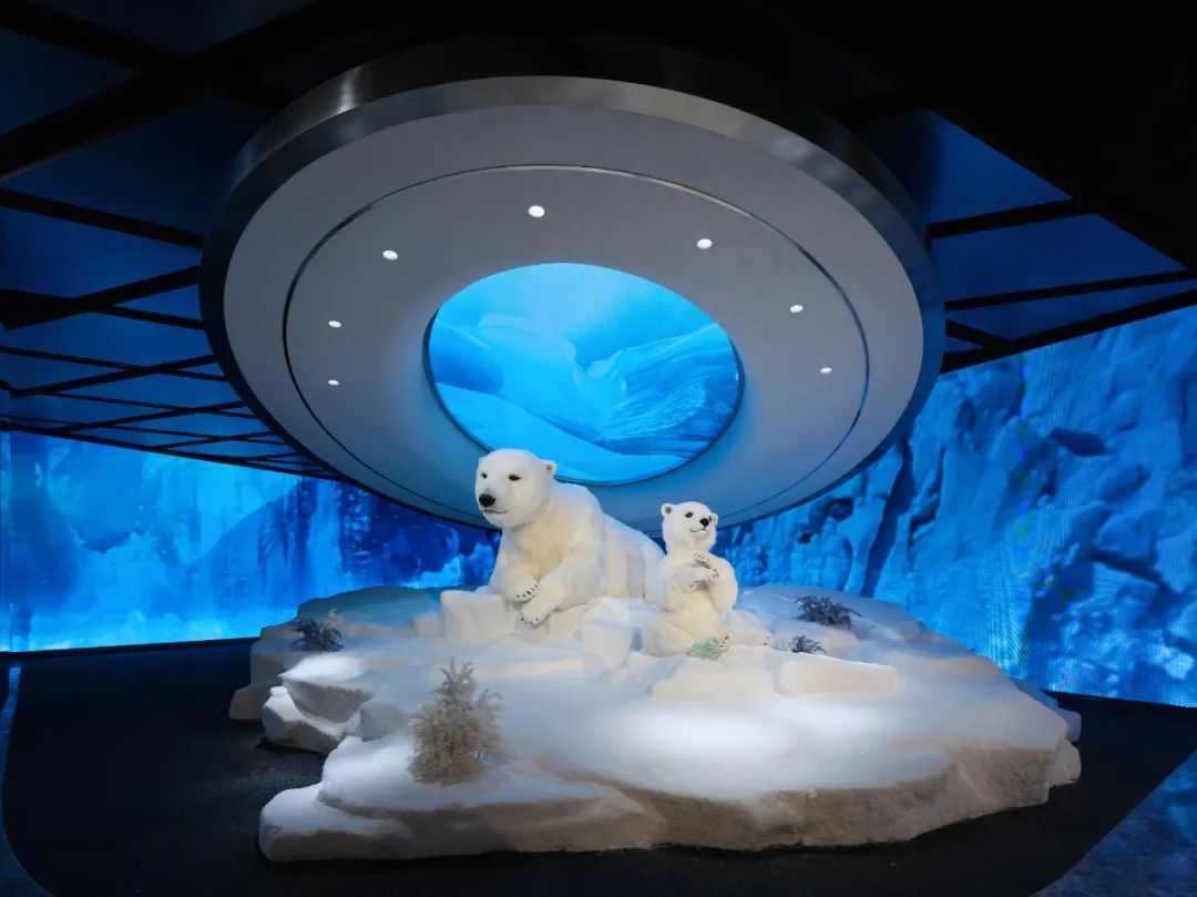 在入口《无边的浮冰》装置区,因全球变暖导致海平面上升,冰原也变得支离破碎。北极熊正努力的重建家园,并随时迎接生存的挑战;