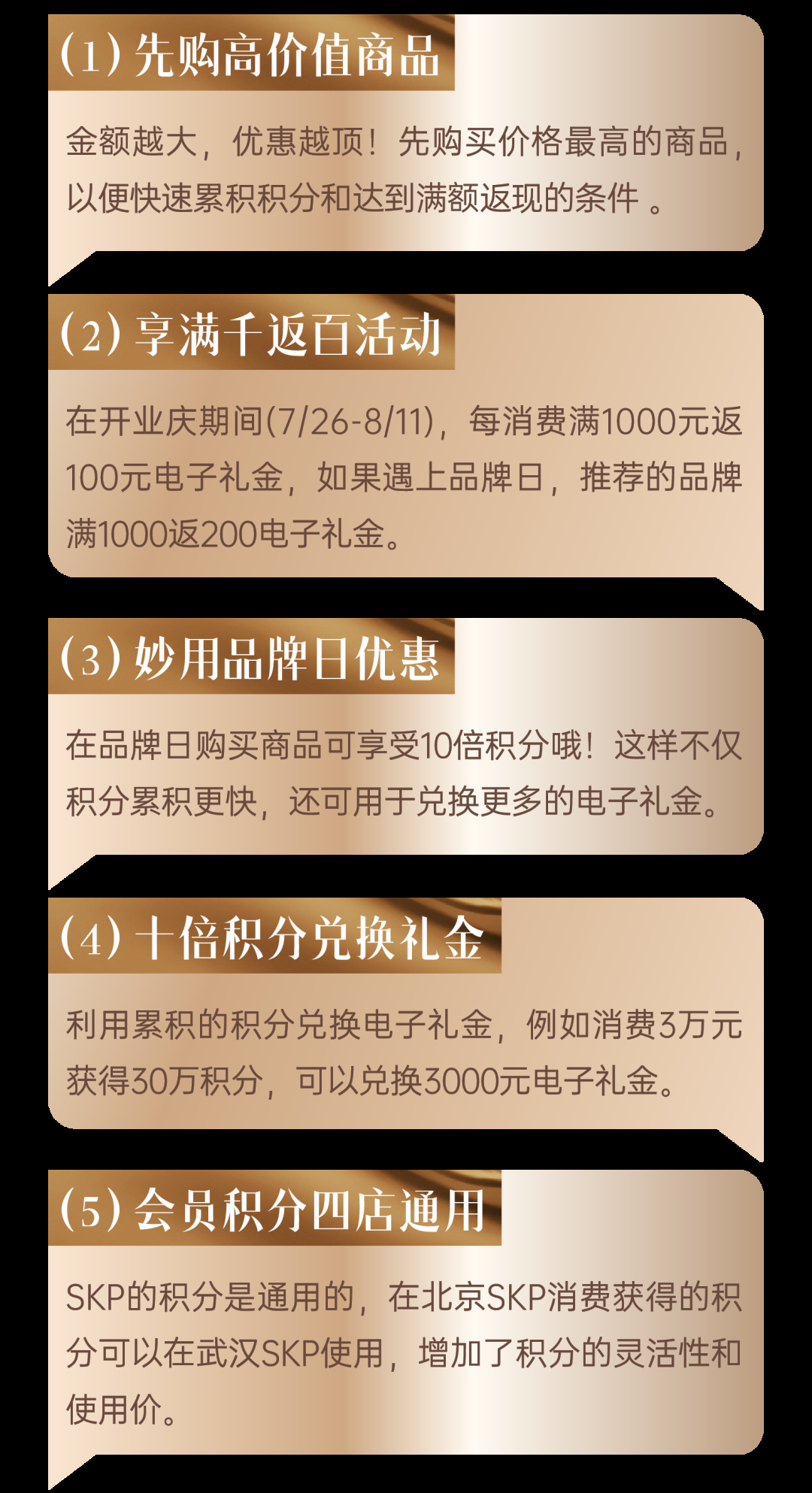 7月26日-8月11日,购物满千返百、会员满额赠礼、新会员开卡礼遇、会员消费礼遇、品牌日10倍积分、SKP推荐品牌满1000返200......还有霸王餐等你抽。