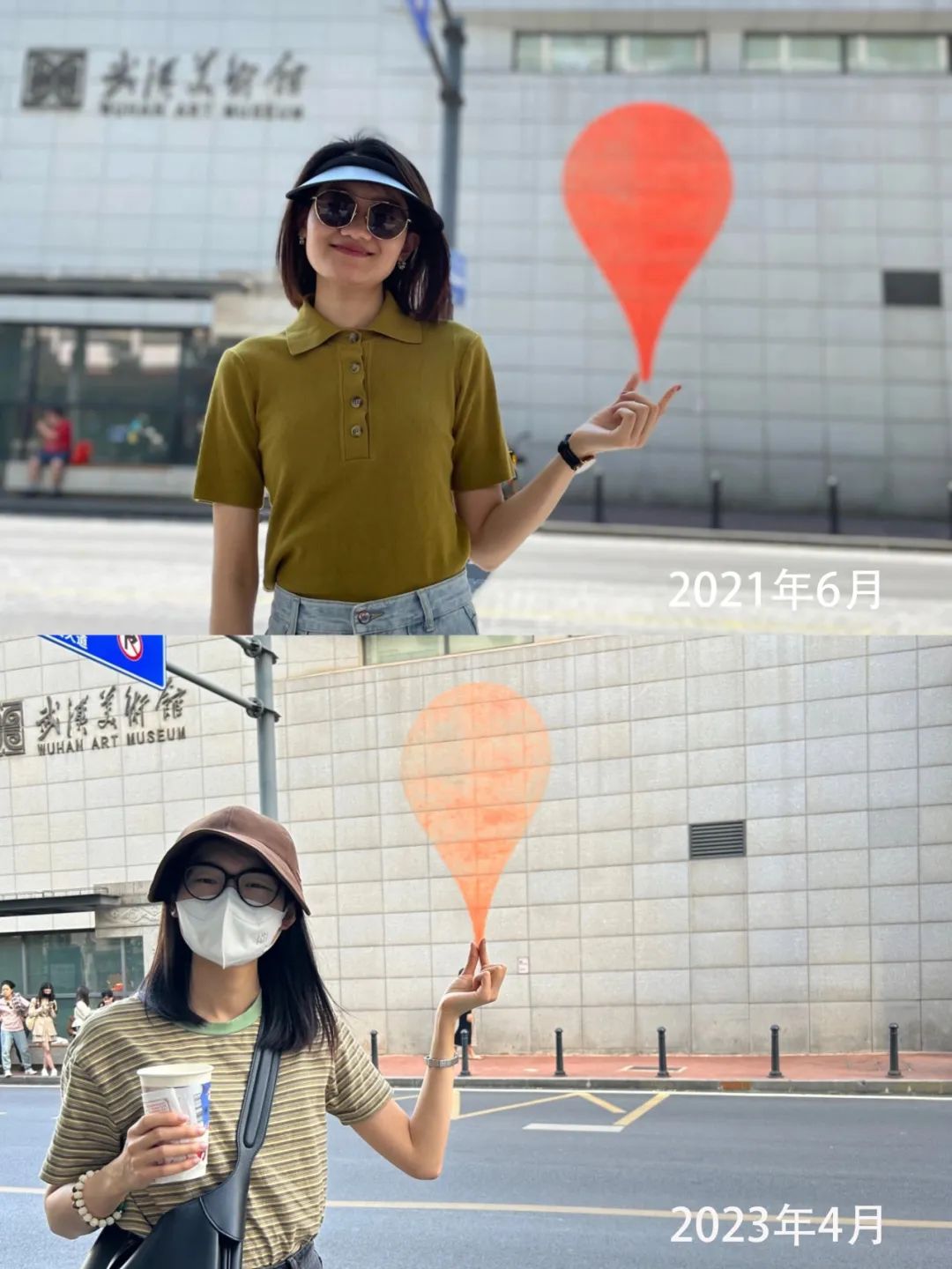 有网友晒出自己时隔两年在武汉美术馆外与“气球”的打卡照: