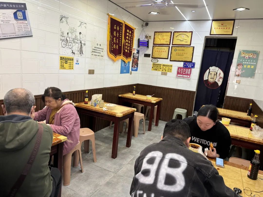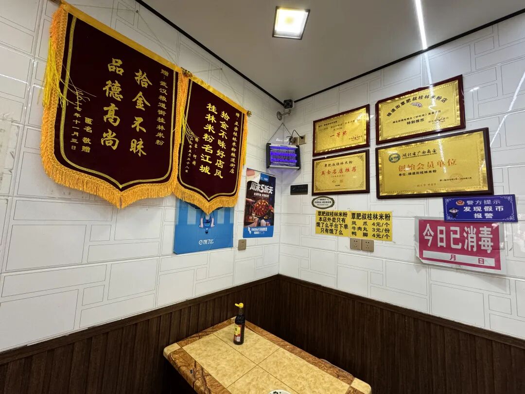 覃草凤说:“很多人都是从学生时期吃到结婚生子,大多数来的都是回头客。”墙上挂满了锦旗和奖状,都是覃肥叔桂林米粉店的荣耀和用心。
