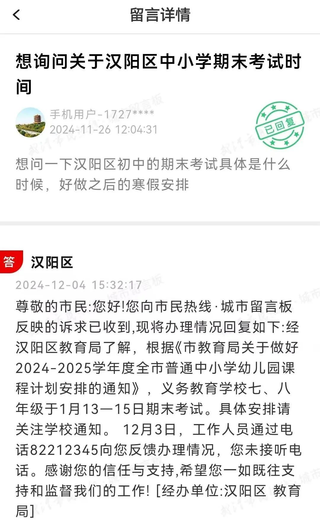 此外,武汉全市义务教育学校三至六年级期末考试时间为1月13日;部分区义务教育学校七、八年级期末考试时间将在2025年1月13日至1月15日举行。