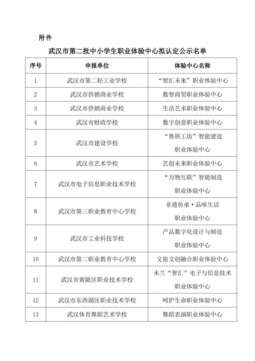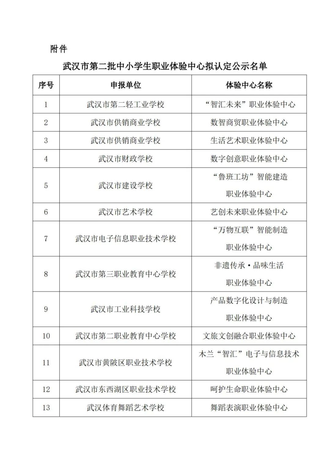 根据《关于开展2024年武汉市中小学生职业体验中心认定工作的通知》要求,经单位自评申报、区级审核,市教育局组织专家评审复核,拟认定12家单位13个职业体验中心为第二批武汉市中小学生职业体验中心(名单见附件),现将拟认定名单予以公示。公示时间:2024年12月4日—10日。