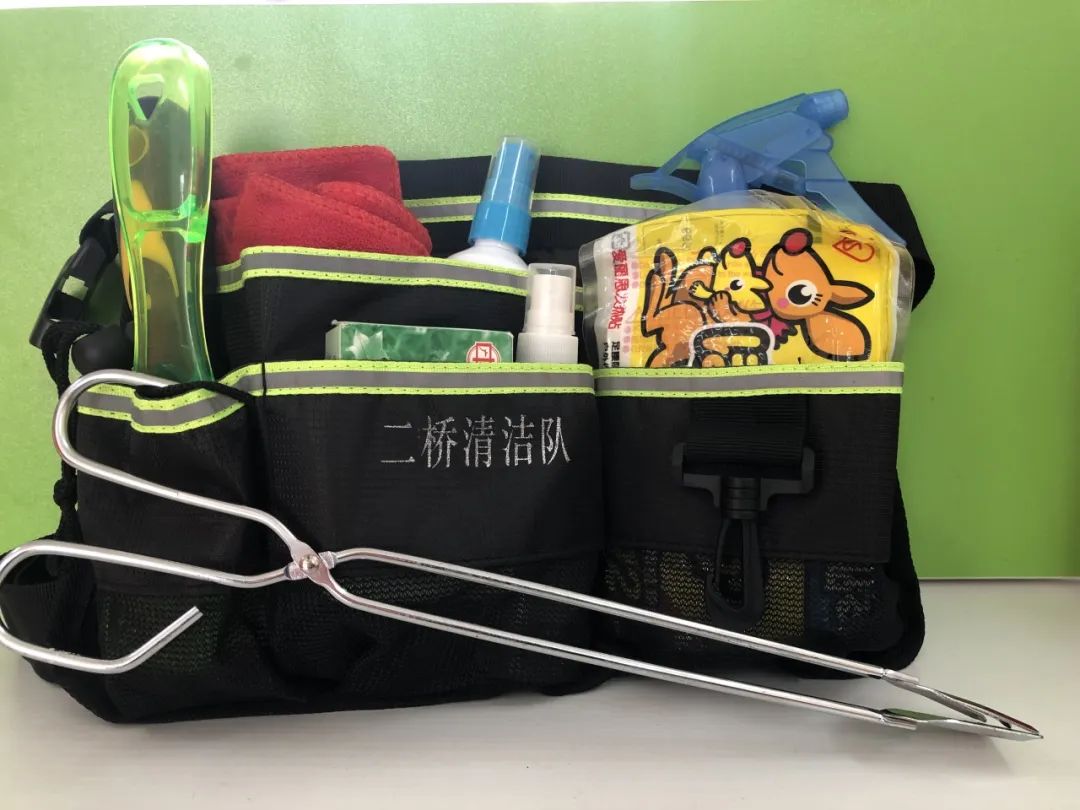 正如队长付国炬所说,二桥清洁队是一支热爱环卫事业,有着创新传统的队伍。之前范建华就创新“发明”过一款环卫多功能清洁腰包,里面是喷水壶、洗洁精、小型铲刀、喷漆罐、刷子、抹布、小镊子、长柄镊子、手电筒等清扫保洁的作业小工具。