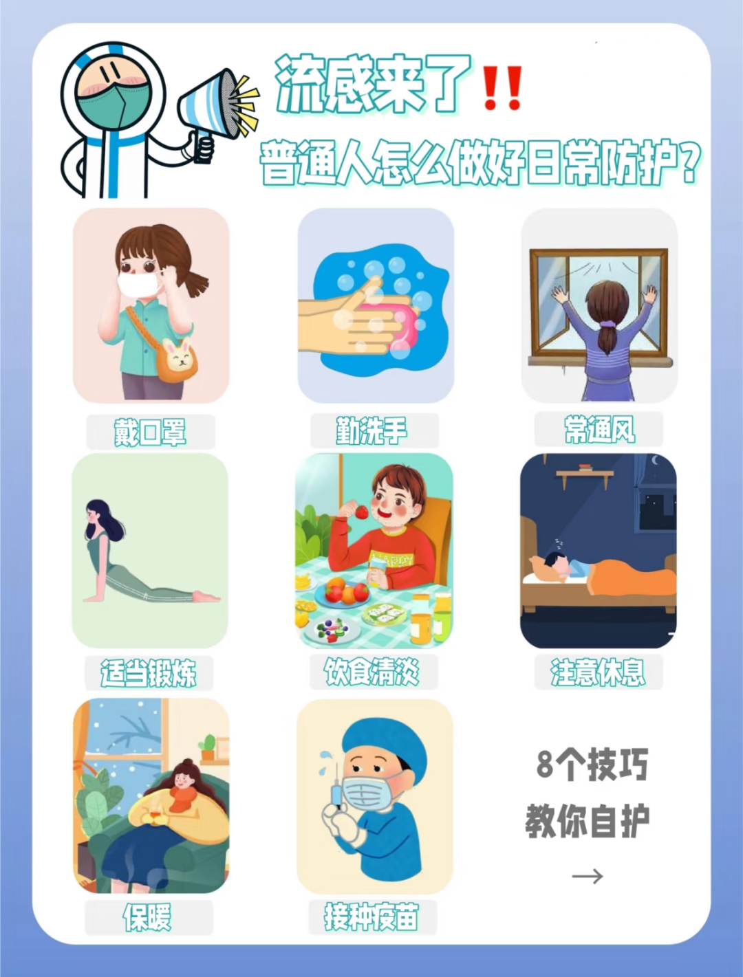 1.保持良好的卫生习惯。流感季远离聚集性场所,戴口罩,勤洗手,多通风。