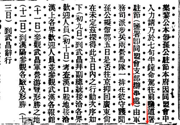 1912年4月9日,孙中山乘船从南京来到武昌,由文昌门下船后,到都督府(今阅马场“红楼”)与鄂省军政各界代表会面。会谈结束后,黎元洪原本留孙中山在都督府下榻,由于同盟会中人力邀,孙中山最终决定到三道街同盟会湖北支部办事处(原湖北盐法道署)居住。