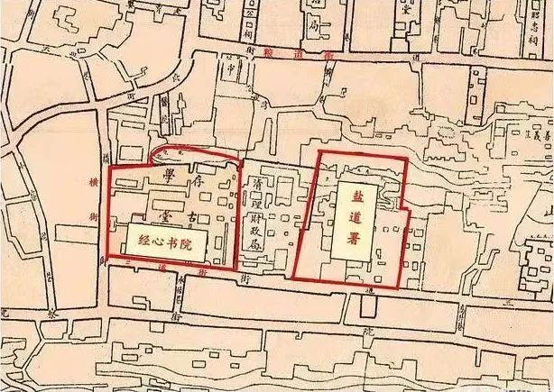 经心书院旧址后改存古学堂(来源:1909年武昌省城最新街道图)