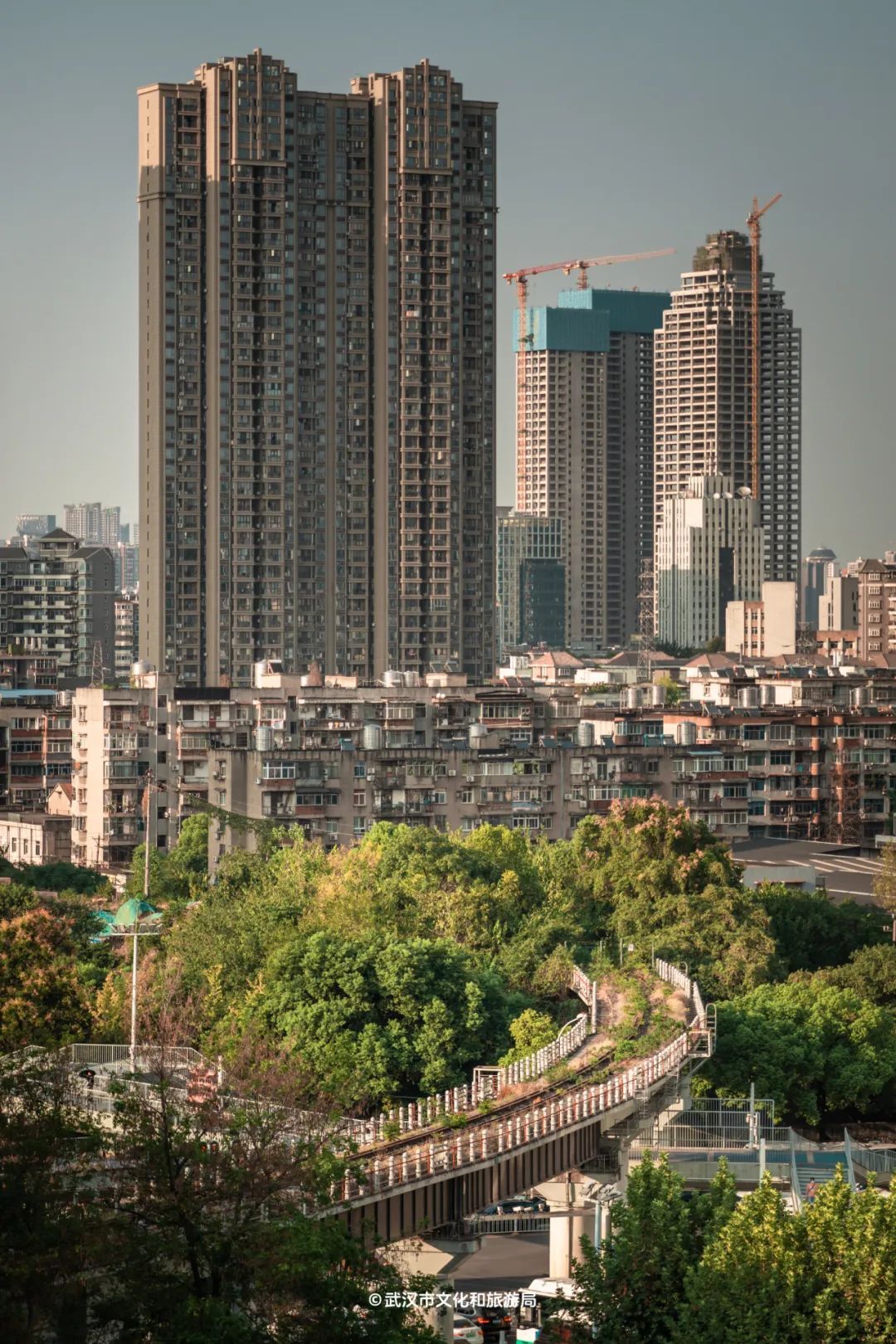 从首义公园东门附近北望,蜿蜒的铁路伸入丛林与民居,和熙熙攘攘的街道形成神奇的组合。
