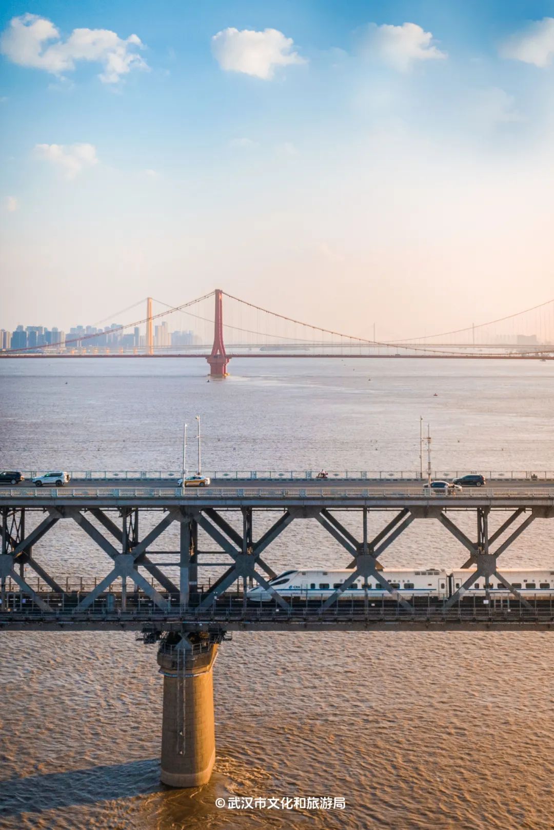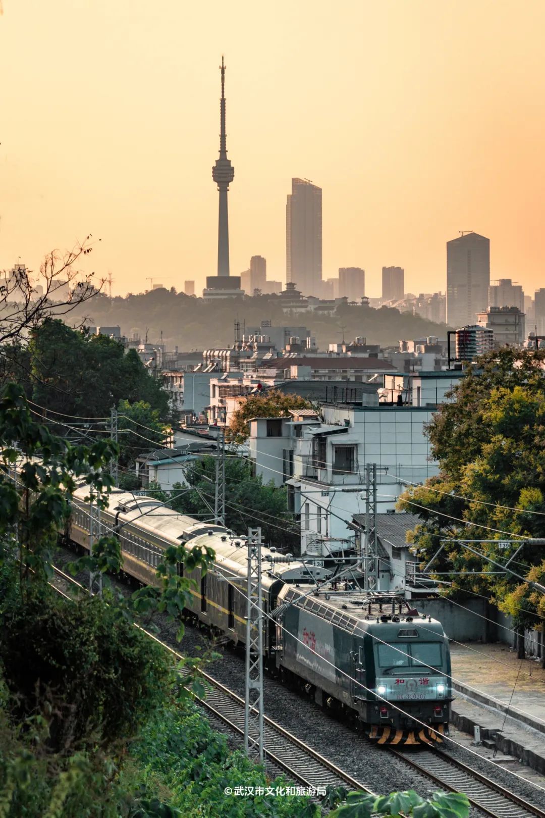 和长江大桥上一样,列车照例几分钟一趟轰隆驶过,不同的是远景由蛇山和黄鹤楼变成了龟山和龟山电视塔。