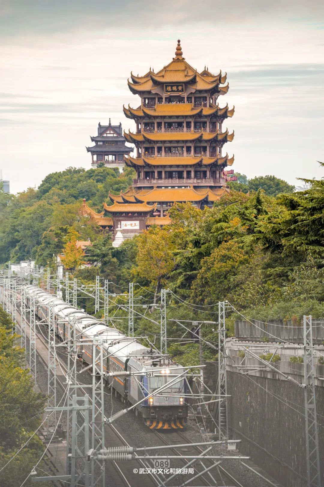 在长江大桥武昌桥头往东200米,黄鹤楼、白云阁、胜像宝塔和京广铁路巧妙融合在一起,每隔几分钟就有一趟列车经过,同框照轻松拿捏!