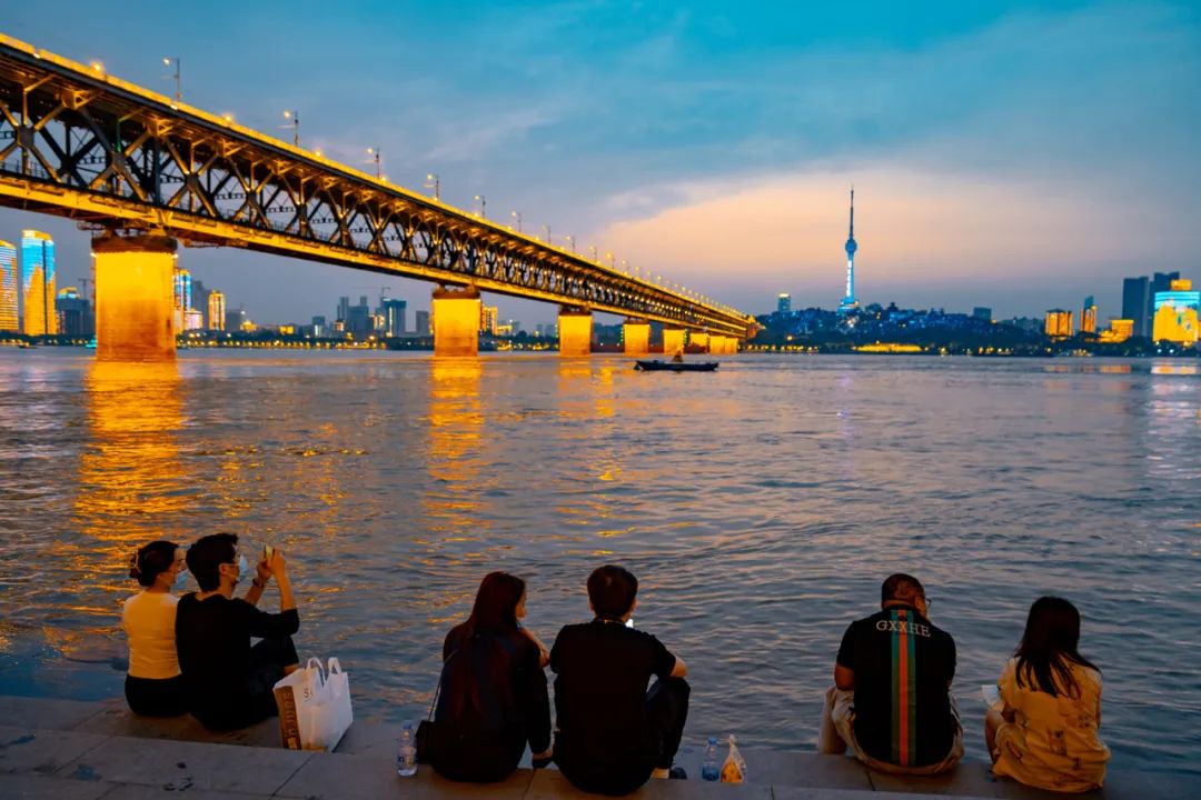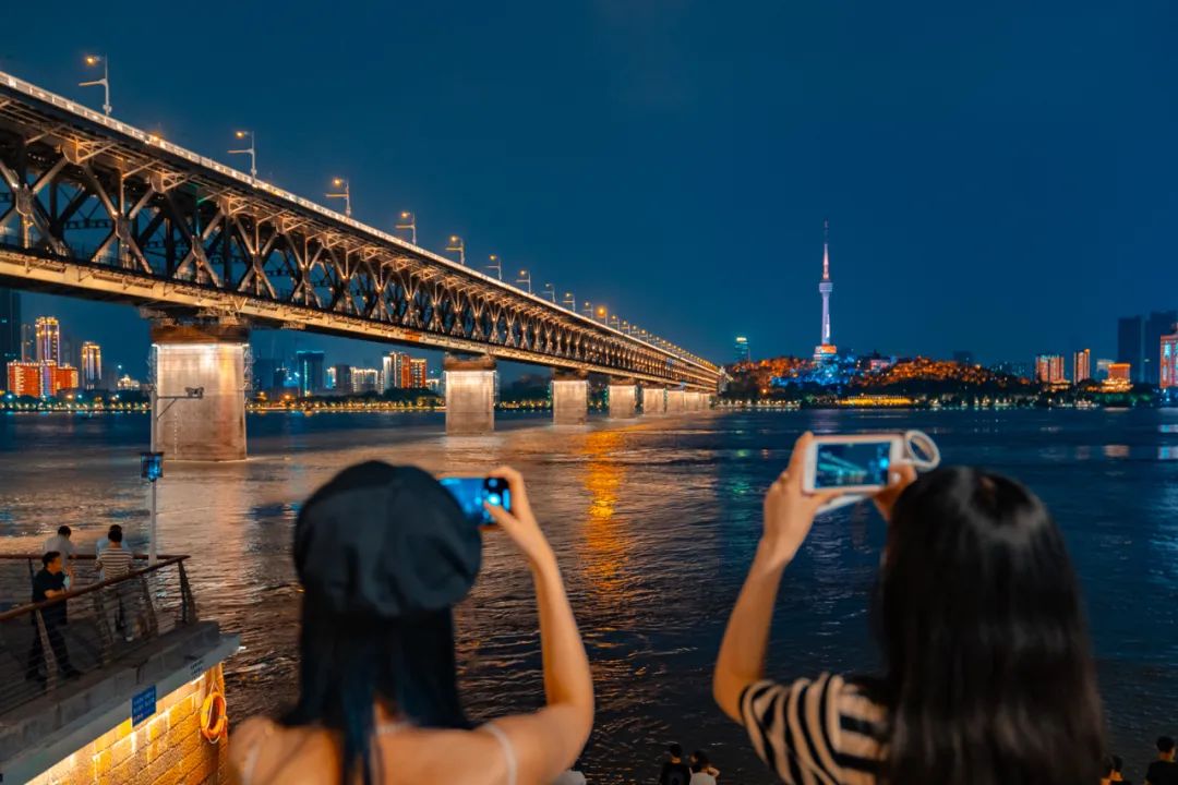 落日余晖,站在长江大桥上,迎面看是绝美落日和龟山电视塔同框,回头看是巍峨的黄鹤楼,在金色光芒下熠熠生辉,宽阔的江面上还可以远眺杨泗港长江大桥、长江二桥,处处是景。