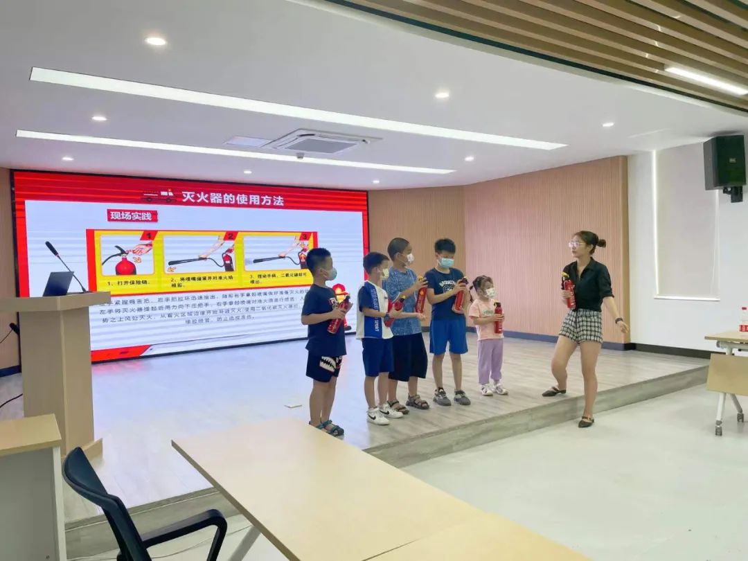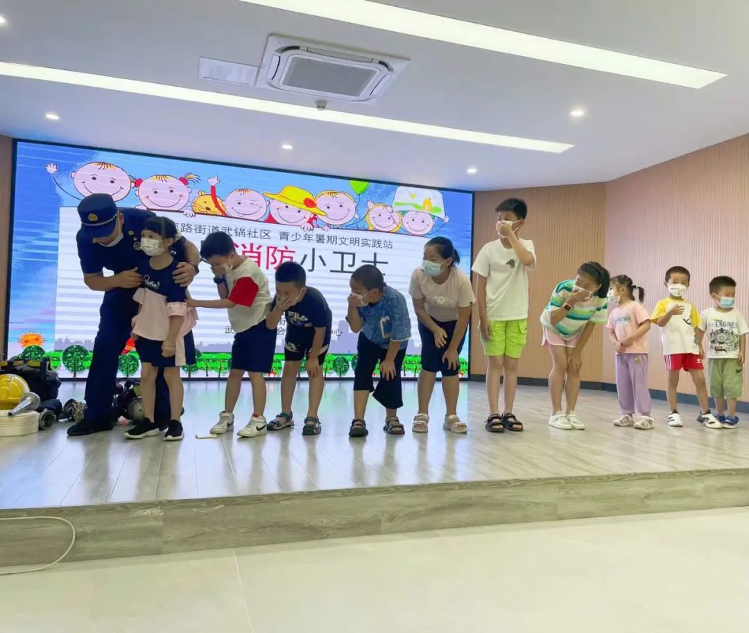 孩子们还进行了火灾逃生演习,跟着领队的消防员,捂住口鼻、匍匐前进,有序撤离模拟“火场”。