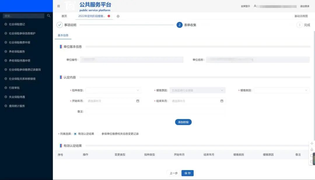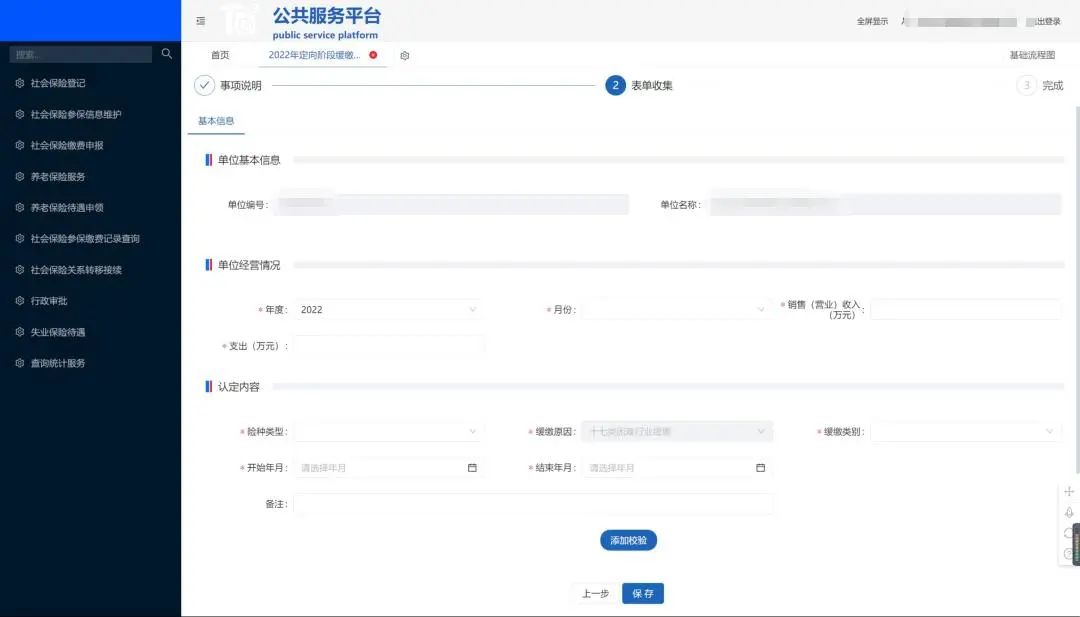3.中小微企业、个体工商户及社会组织缓缴网上办理流程可通过搜索进入【2022年定向阶段缓缴期确认】。01选择险种类型为