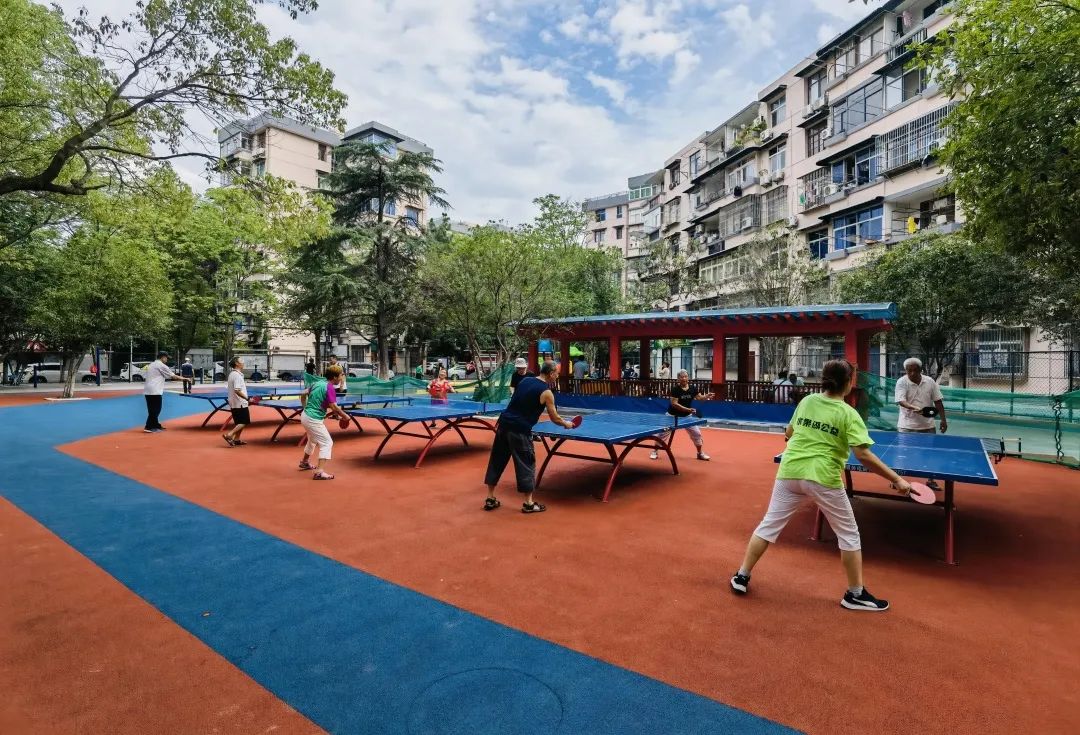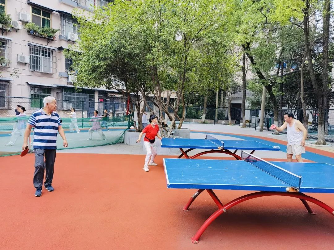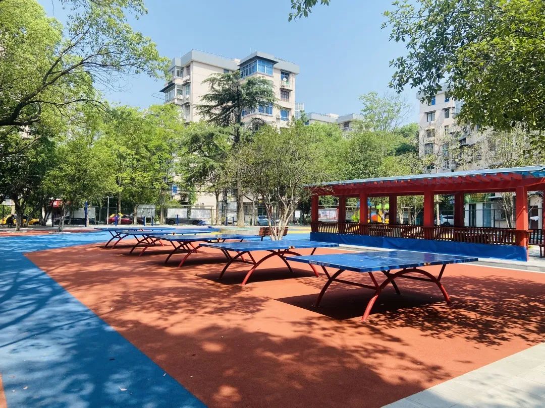 东亭社区内有着一块300平米的空地,以前是休闲场,大家伙儿喜欢在这里聊天、纳凉。去年推进老旧小区改造后,休闲场提档升级为“乐龄运动场”,增设了乒乓球台,规划了羽毛球场、老年健身及儿童乐园等区域。