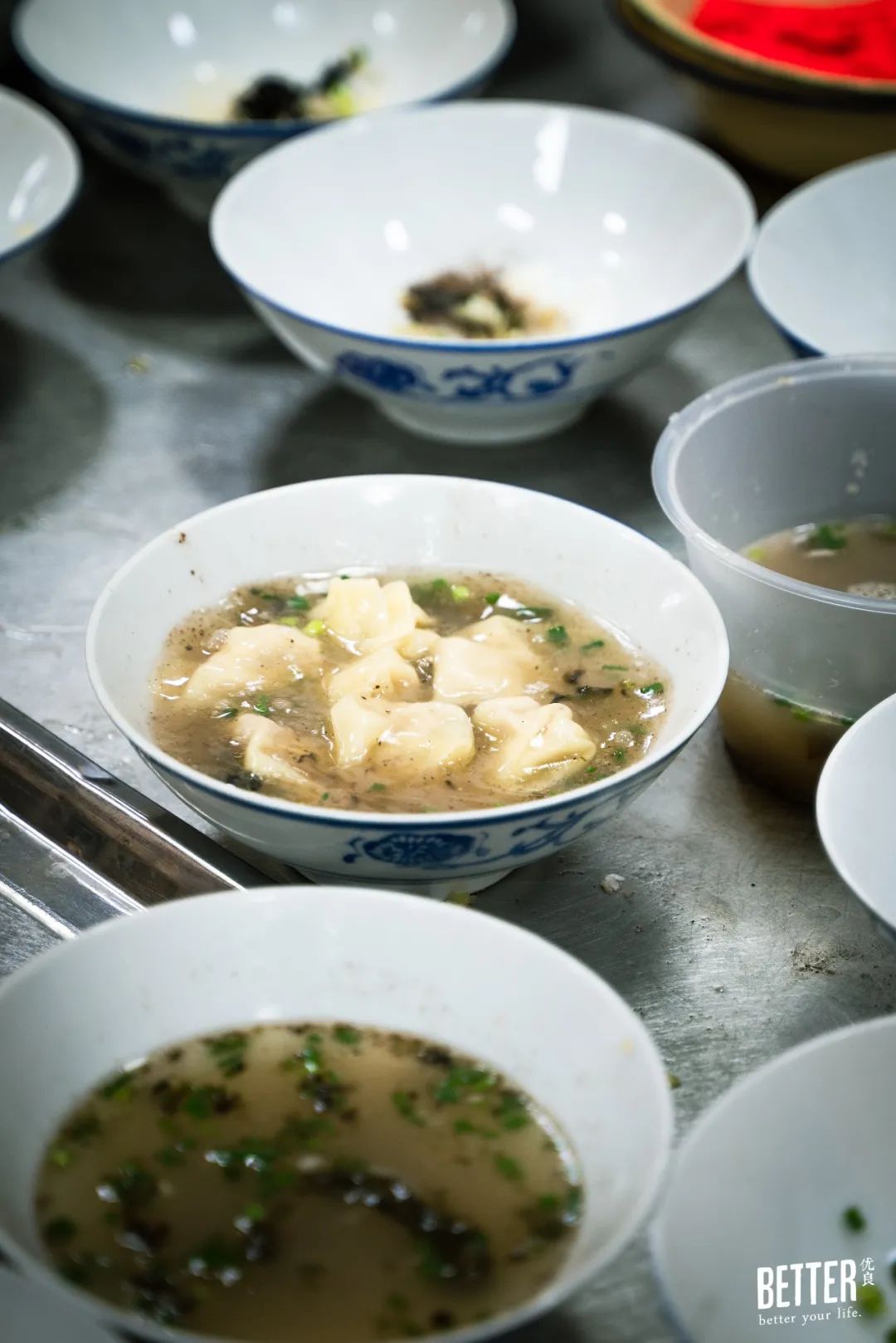 付款后凭红色塑料小票拿餐,一字排开的蓝边大口土瓷碗,皮薄肉厚原汤中有猪油味的水饺。同时旁边的窗口,正在不断手工赶制水饺。