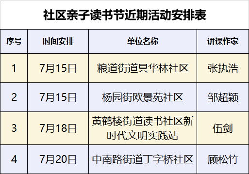 今年社区亲子读书节以“强国复兴有我 悦读筑梦未来”为主题,围绕学习、宣传、贯彻党的二十大这一主线,邀请董宏猷、张执浩、黄春华、伍剑、舒辉波等湖北省知名儿童文学作家赴辖区13个社区和7个新时代文明实践中心(所、站)开展“作家进社区阅读推广活动”,书香武汉视频号、阅读武汉视频号同步直播,线上推广,让更多的家长、孩子们与作家们一起,共同分享关于阅读的美好体验,引导孩子们爱上阅读、爱上写作。