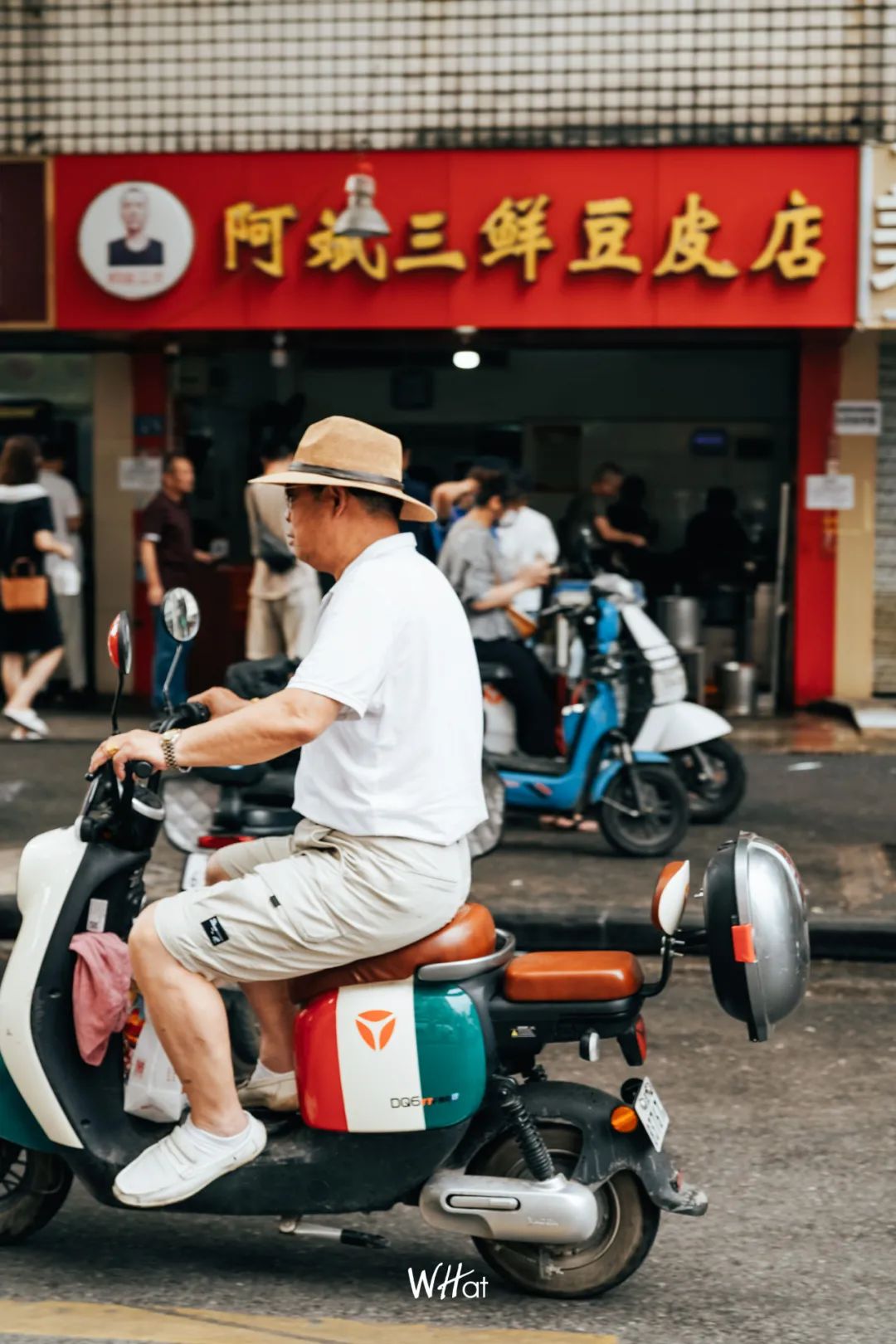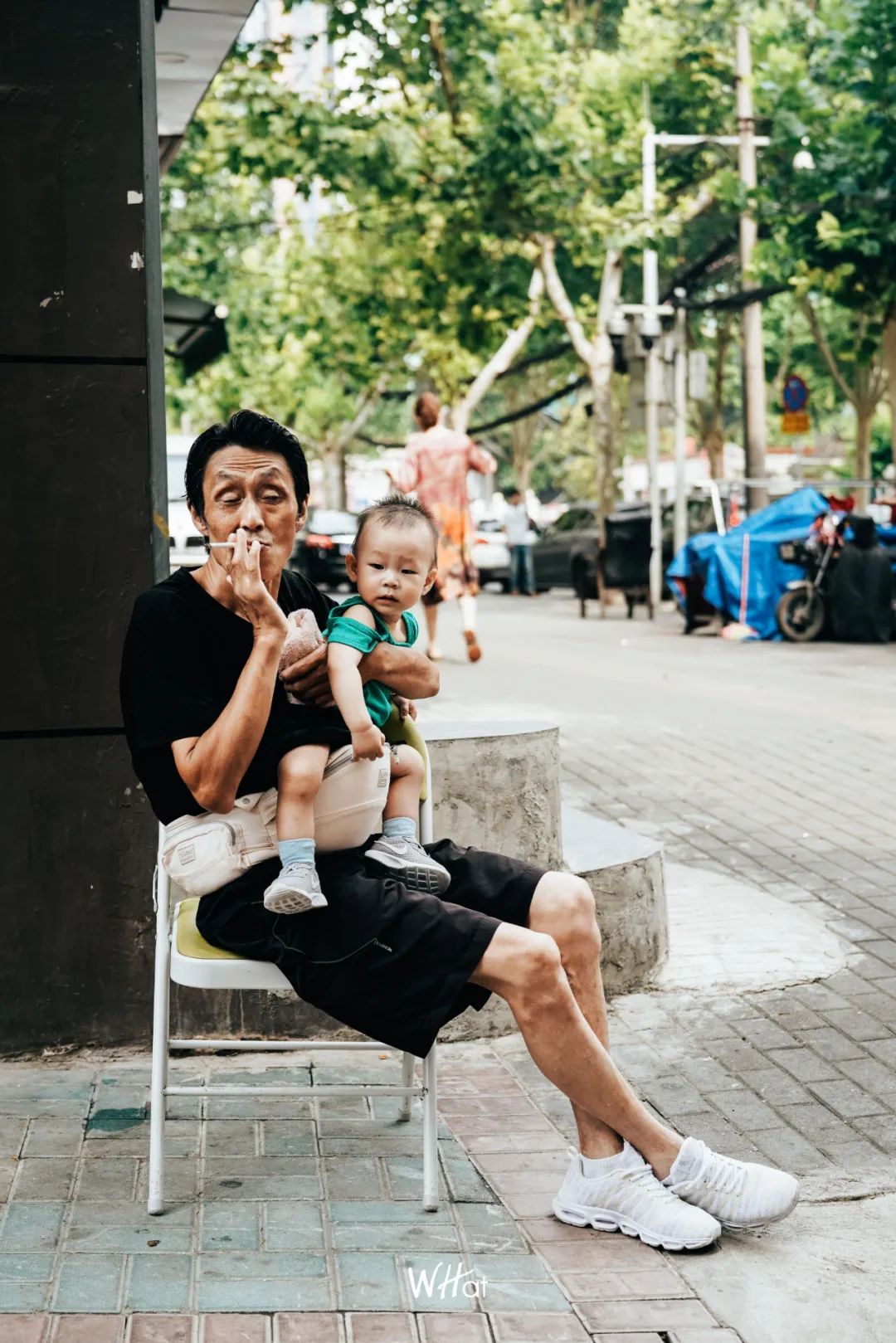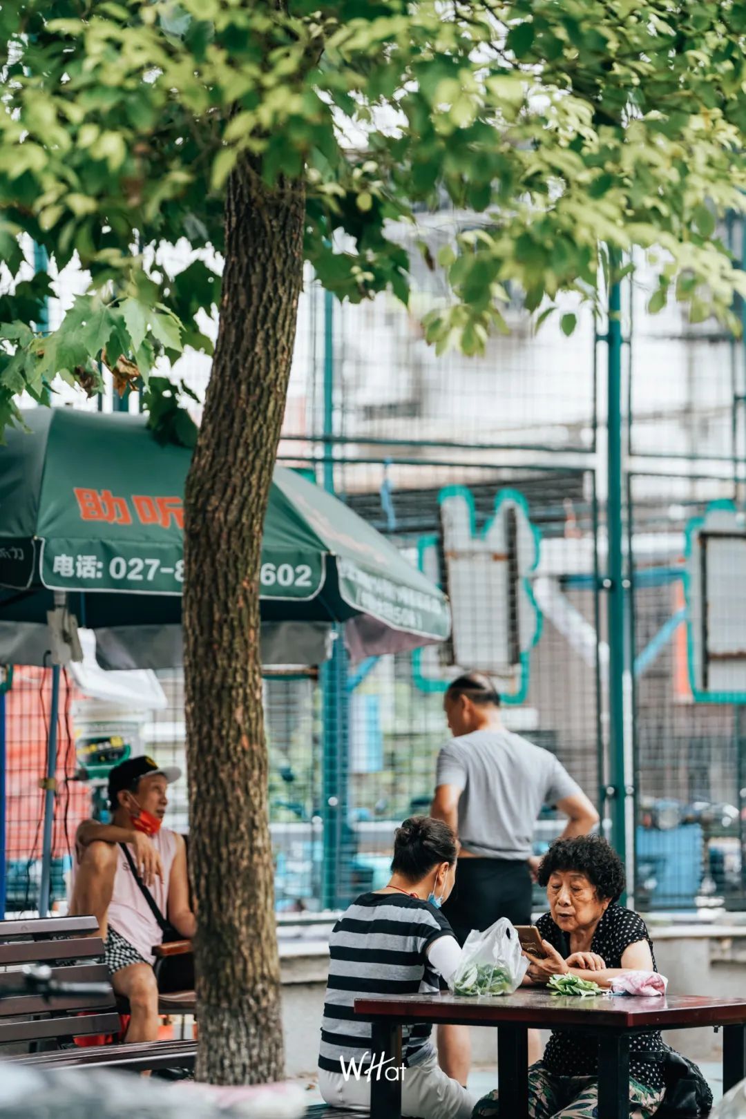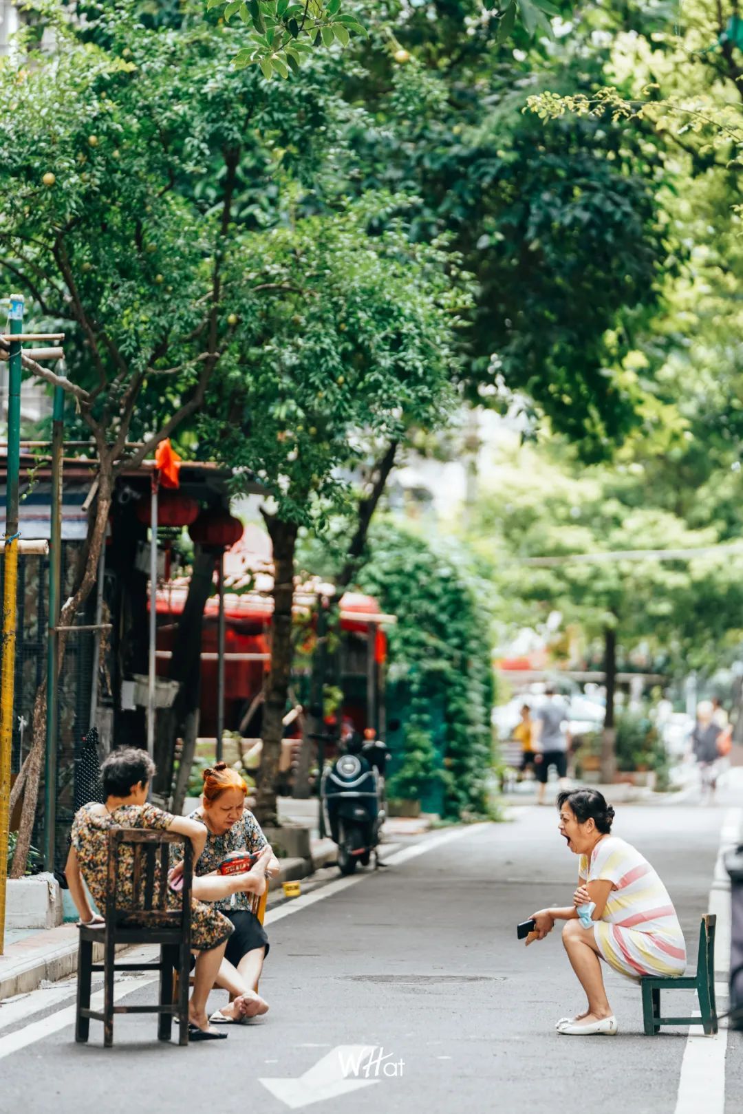 三三两两地闲坐路边长椅,摇摇扇子喝喝茶,度过悠长的夏日上午。