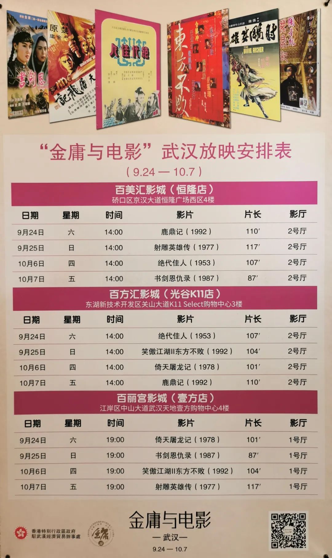 看展览还不过瘾?9月17日,六神磊磊来省图聊金庸啦!此外,参展观众还可现场扫码抽奖,免费观看金庸先生参与编剧或由其作品改编的电影,最早的拍摄于1953年、最晚拍摄于1992年,如今片源都难找。六部影片分别为:《绝代佳人》(1953年拍摄的黑白电影)、《射雕英雄传》(1977年拍摄)、《倚天屠龙记》( 1978年拍摄)、《书剑恩仇录》(1987年拍摄)、《笑傲江2东方不败》(1992年拍摄)。