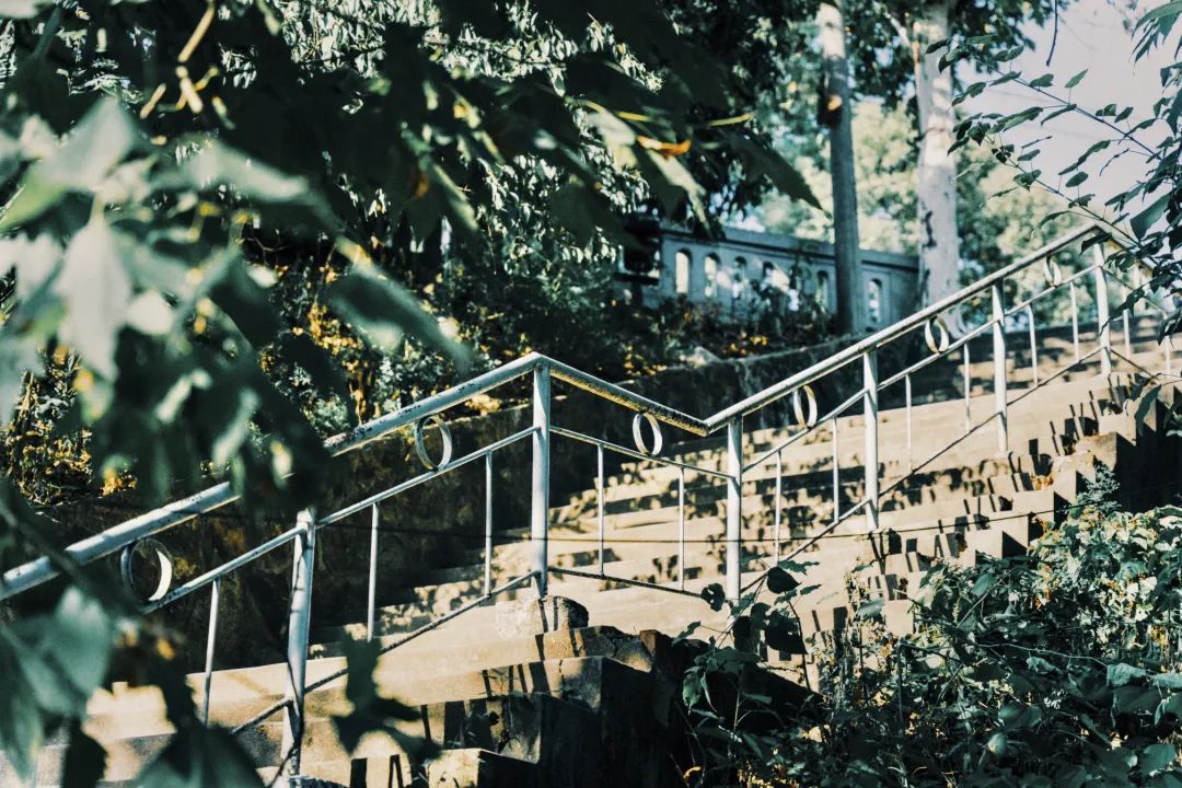 阳光灿烂的时候,光影绰绰,像钢琴琴键,线条与蓝天相接,往上走仿佛就能触碰到天空,走进新海诚的镜头。