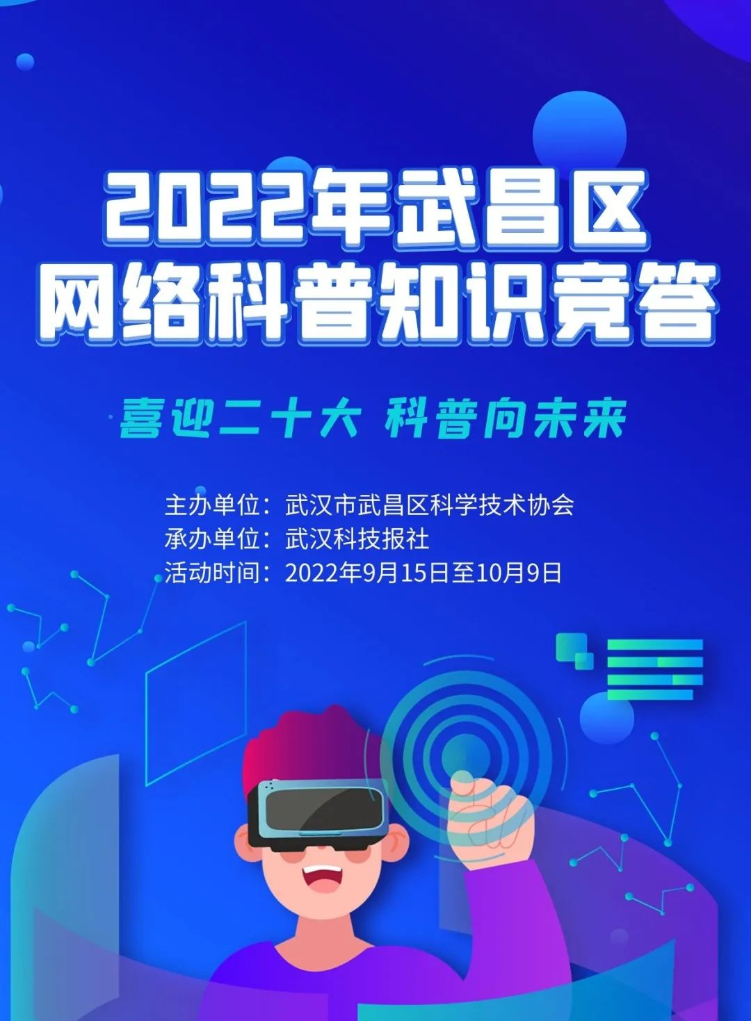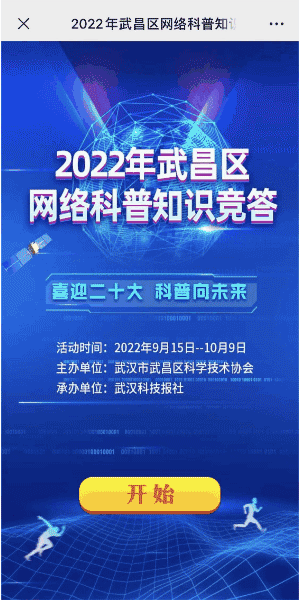2022年是党的二十大召开之年,也是我国进入全面建设社会主义现代化国家、向第二个百年奋斗目标进军新征程的重要一年。为弘扬科学精神、普及科学知识,激发科学梦想和科学志向,助推全民科学素质全面提升,以实际行动迎接党的二十大,2022年“全国科普日”来临之际,武汉市武昌区科协于2022年9月15日至10月9日开展武昌区网络科普知识竞答活动。