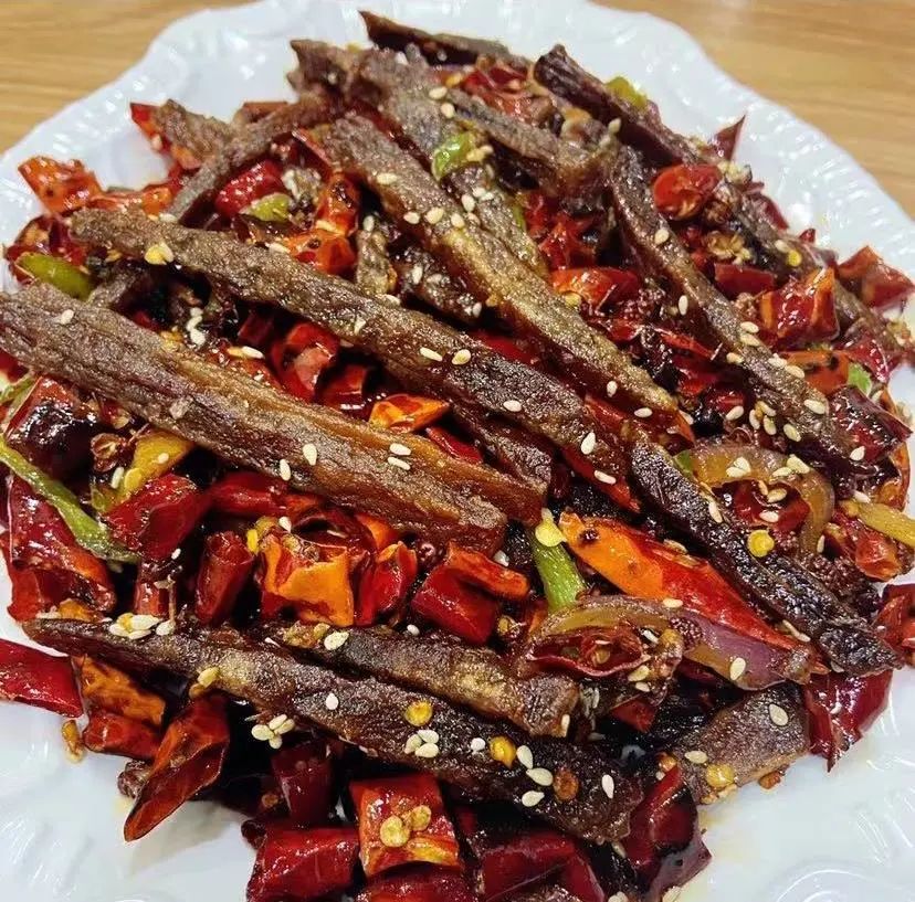 比筷子还粗的“干煸牛肉丝”,新鲜入味的“鱼籽豆腐”,综合了湖北口味的“牛三鲜”几乎都是桌桌必点。