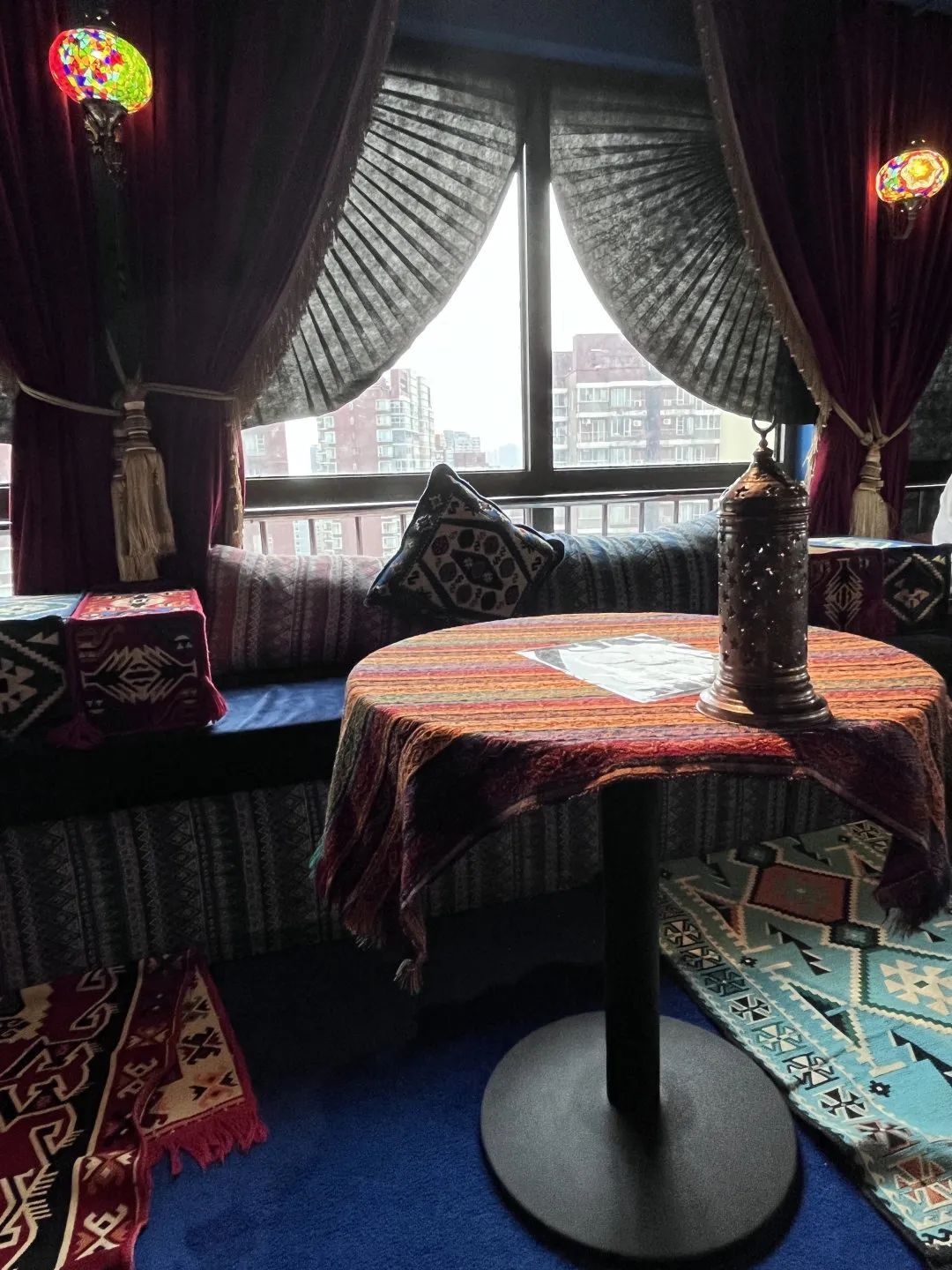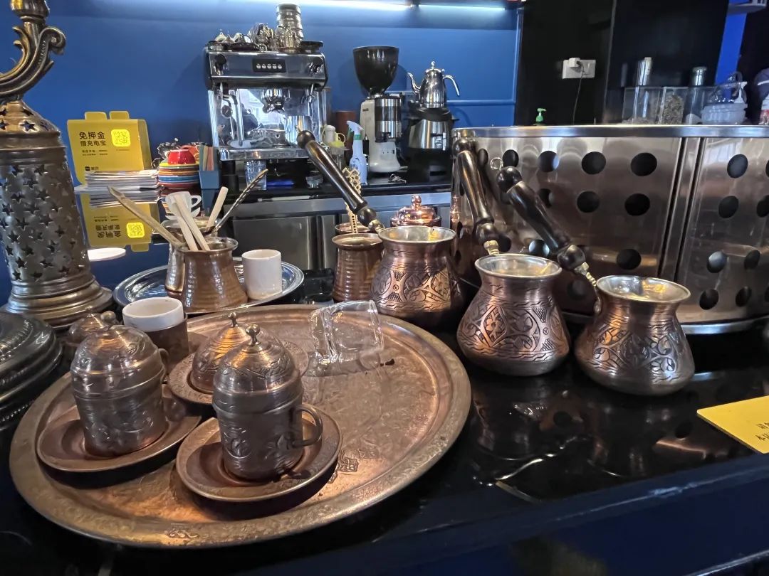 宝蓝色且极具异域特色的陈列布置让人移不开眼,老板用独具土耳其特色的铜制小壶来烹煮,当地人称它为Cevze。