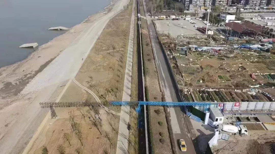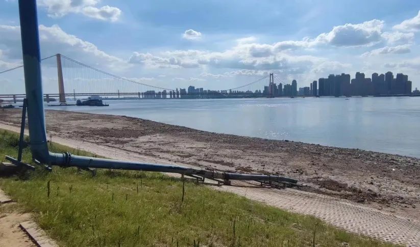现场能够看到,一根蓝色的大水管从项目基坑“出发”,到达八铺街大堤时,爬上了“高架桥”,最后爬下江堤护坡,进入长江。