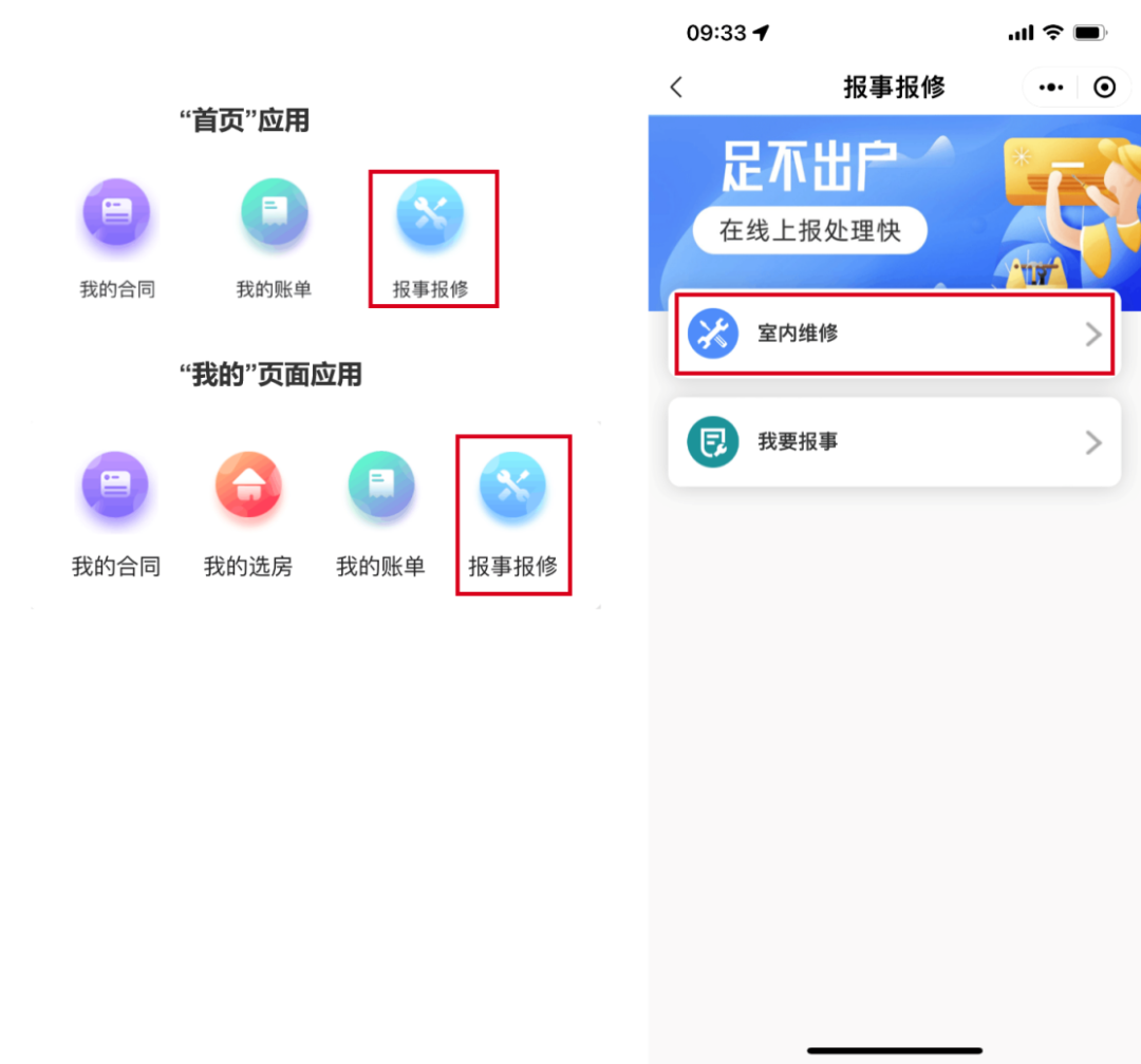 从“首页”和“我的”页面的“报事报修”应用均可进入报事报修主页面。选择“室内维修”栏目进入报修记录页面,通过点击页面中的切换栏进入新增报修页面。