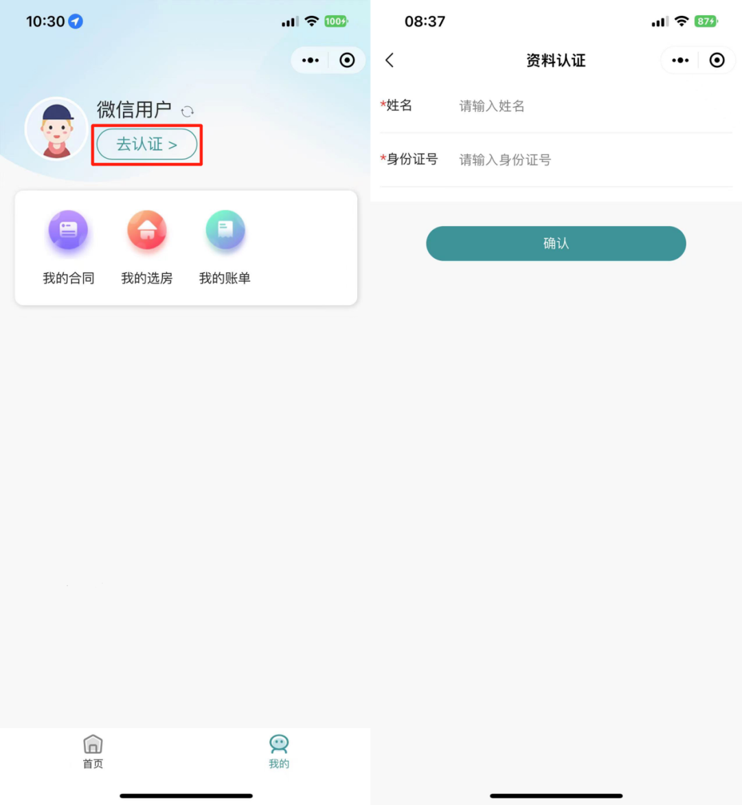 从昵称和头像下方的“去认证”按钮进入资料认证页面。