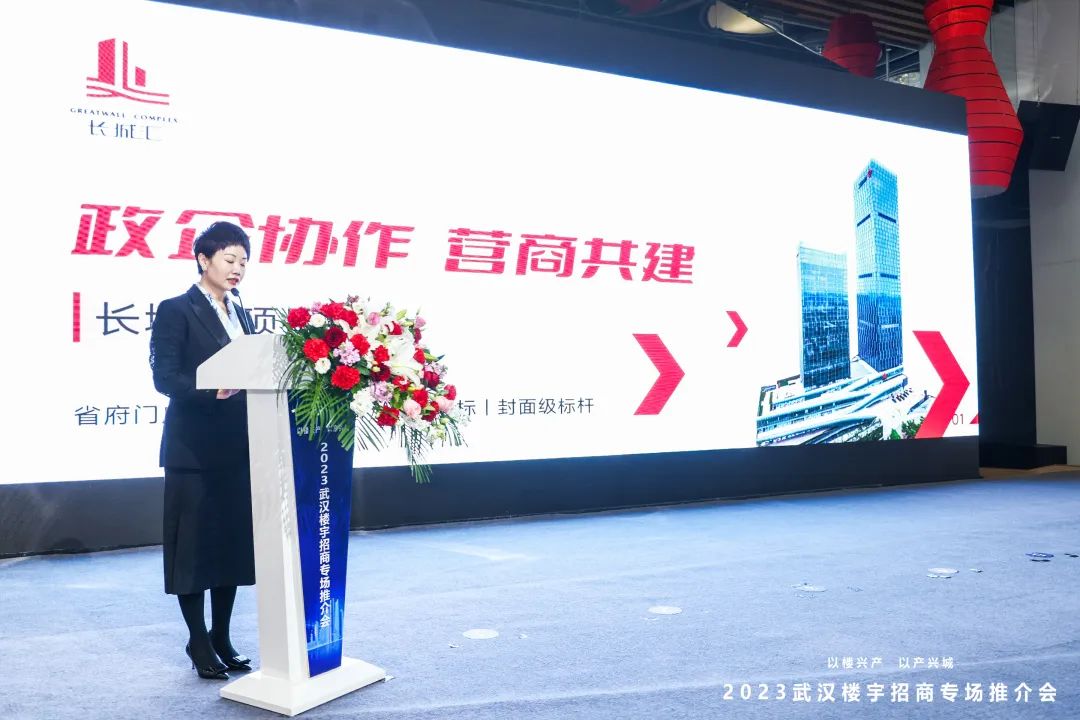 湖北长城建设控股集团有限公司副总裁杨芳代表武昌区重点特色楼宇长城汇,作题为《政企协作 营商共建》的楼宇推介。