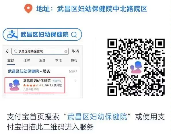 (1)请家长们在支付宝预约挂号,打开支付宝→搜索“武昌区妇幼保健院”或使用支付宝扫描此二维码进入服务(可预约一周内的号源,如当日已经约满可以顺序往后预约)。