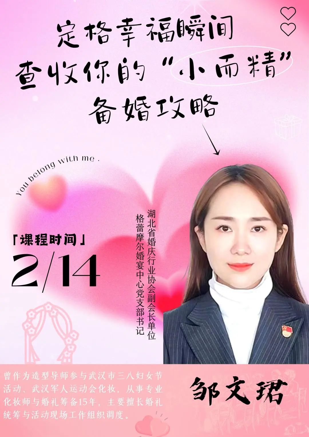 老师介绍:邹文珺,湖北省婚庆行业协会单位格蕾摩尔婚宴中心党支部书记,曾作为造型导师参与武汉市三八妇女节活动、武汉军人运动会化妆,从事专业化妆师与婚礼筹备15年,主要擅长婚礼统筹与活动现场工作组织调度。