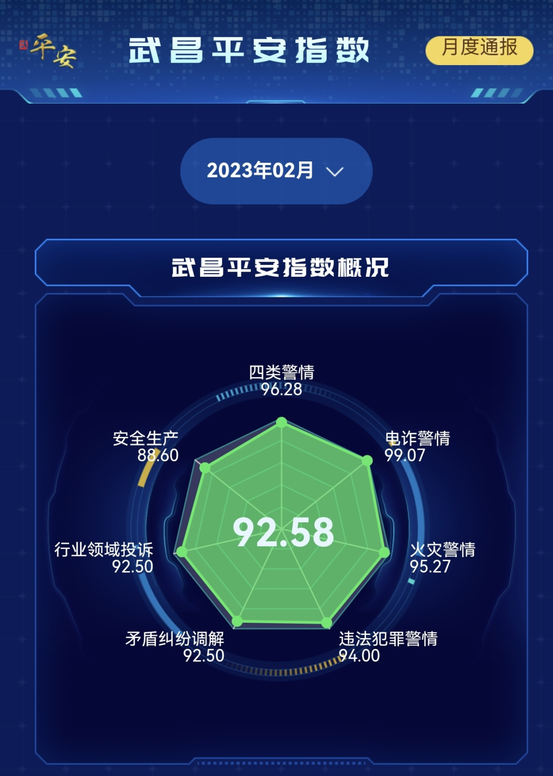 2023年2月,武昌平安指数92.58,平安状况为优。四类刑事有效警情发案数与上月相比有所下降,39个社区实现“零发案”;电信网络诈骗警情发案数与上月相比有所下降,68个社区实现“零发案”;违法犯罪警情发案数与去年同期相比有所上升;消防警情与上月相比大幅下降;矛盾纠纷调解成功数与去年同期相比、与上月相比均有所上升。