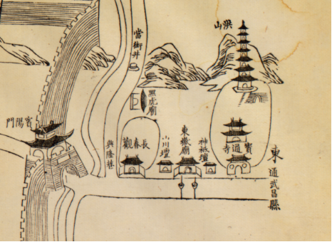 “大东门外有长春观,为著名之道观,再东为博文书院,为基督教会所办,亦为培植教徒之所,再往东行,为东岳庙内祀东岳大帝,配以十殿阎罗,森严恐怖,每年农历三月二十八日,为东岳大帝诞辰,值暮春三月,草长莺飞,倾城仕女,来此踏青游览,称为游洪山,而洪山宝通寺,又为佛敎十方丛林,有常住静修及挂单和尚二三伯人,香火鼎盛。”