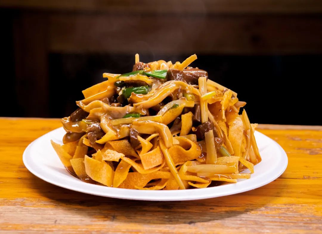 菜品主要原料有黄牛肉、湿豆丝、水发香菇、笋片,牛肉酥滑鲜嫩有嚼劲,豆丝绵软滋润又可口。豆丝按顾客要求可以枯炒,也可软炒,还能糊汤。只用5分钟,一盘香气四溢的豆丝便端上桌来,牛肉与豆丝交融,别有一番风味。