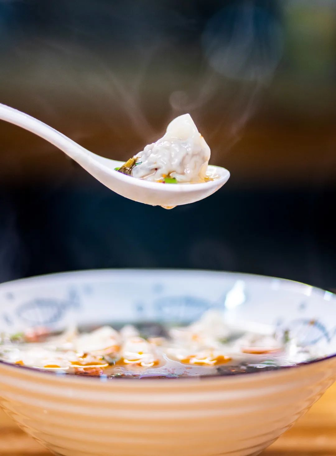 泛着油花的大骨原汤,浓郁鲜香,回味无穷;馄饨皮煮熟后晶莹剔透,入口即化;肉馅鲜嫩多汁,口感细腻,由袁老板亲手调制而成——这一碗鲜汤馄饨,能勾起无数武汉人的儿时回忆。