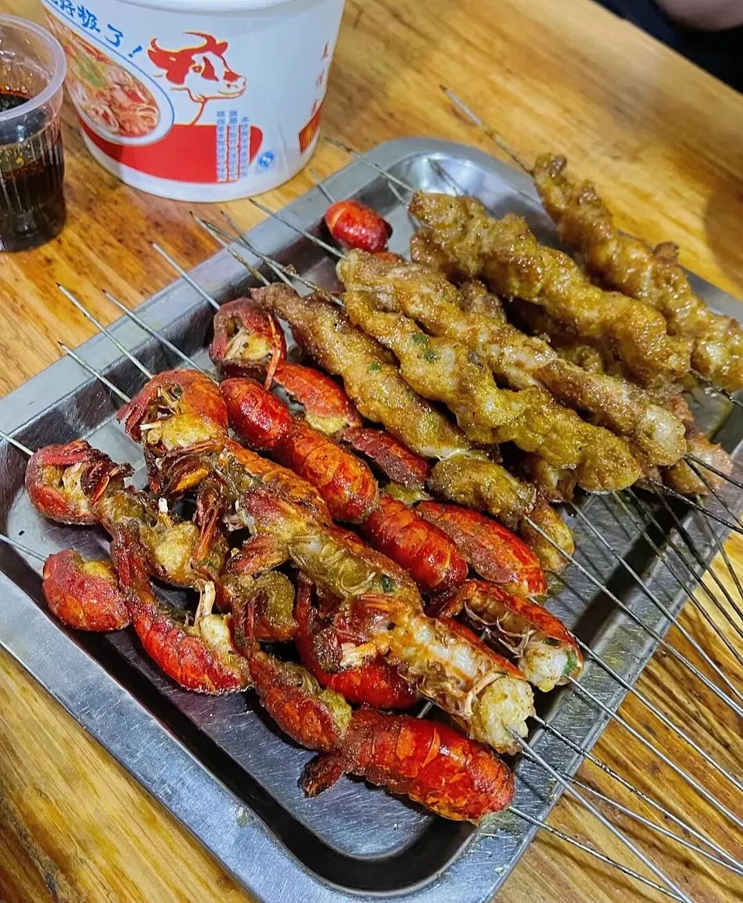 除烤虾之外,还有肉串、肉筋、凤爪、土豆、韭菜……菜单品类齐全,烤上满满一桌,荤素搭配,再叫亲朋好友一同坐下畅聊,岂不美哉?