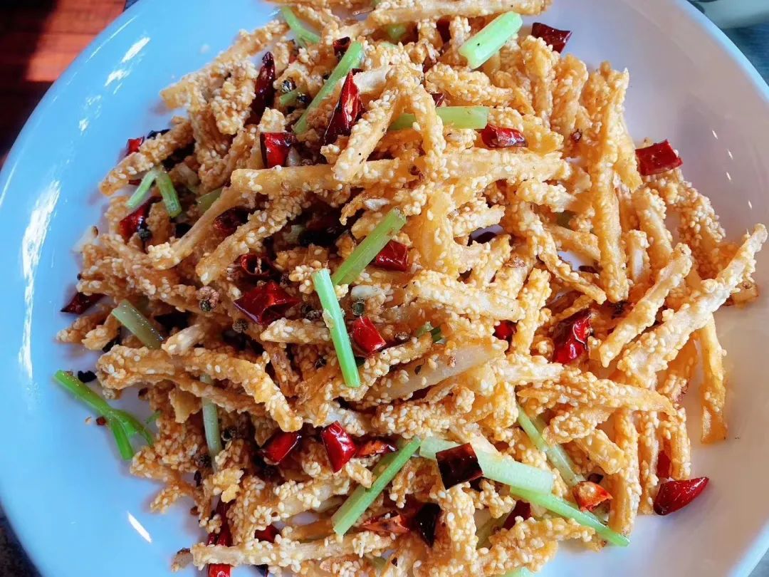 椒麻藕丝,每根藕条上都裹了白芝麻,香酥可口。把它当作餐前餐后的小零嘴,再好不过。
