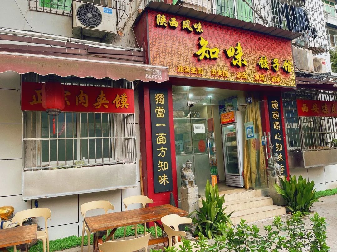 知味饺子馆门前整齐排列的桌椅,直立向上的绿植,给人方寸之间皆为热爱的感觉。