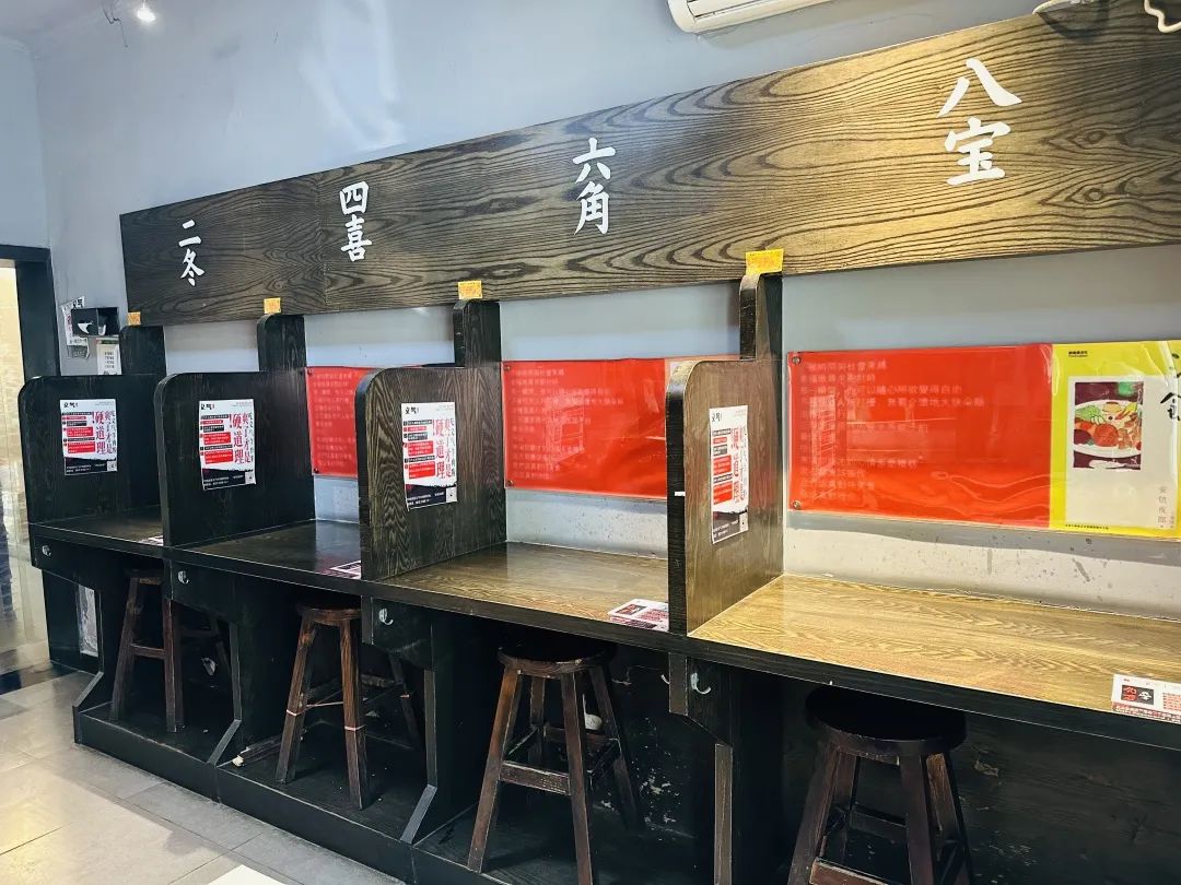 店铺外观看着普普通通,走进店里,给人一种旧旧的日式居酒屋的感觉,靠墙边桌子都做了隔断,每个隔断间都有自己的“专属名片”,二冬、四喜、六角 、八宝……