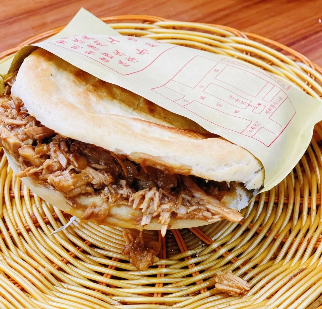 老板极力推荐的,是现场烤制的白吉馍做的肉夹馍。加上秘制的卤肉,淋上一小勺卤肉酱汁,配合松软可口的馍,那叫一个绝绝子。