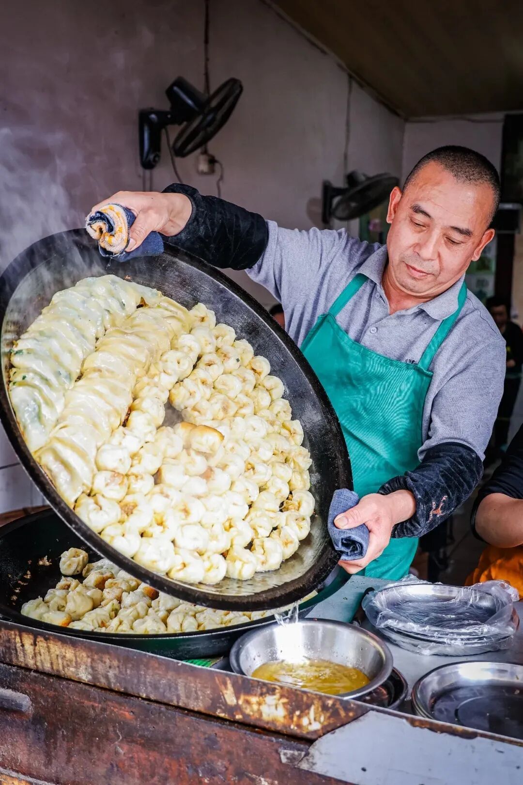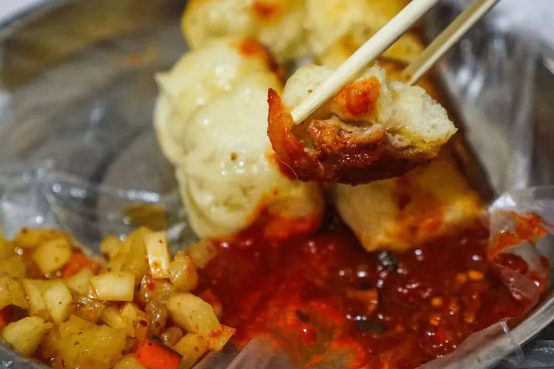 1元钱2个的包子,面团发得又香又足,包裹着带着葱香的肉馅,在一口大锅里煎得金黄酥脆,再配上老板自己腌制的辣萝卜和辣椒酱,一口让人沉沦。